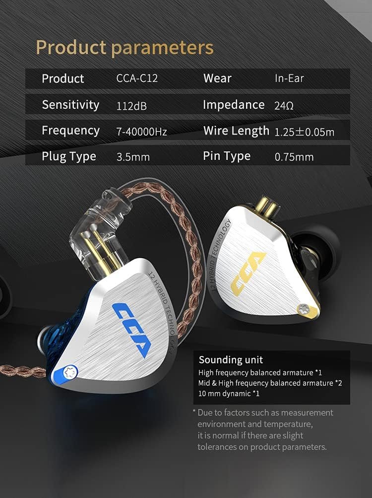 Brand: CCA Product Model: C12 Wearing Type: In Ear Impedance: 24Ω Frequency: 7-40000Hz Sensitivity: 112dB Connect Type: Wired Wire Length:3.95ft±1.2in / 1.2m±3cm