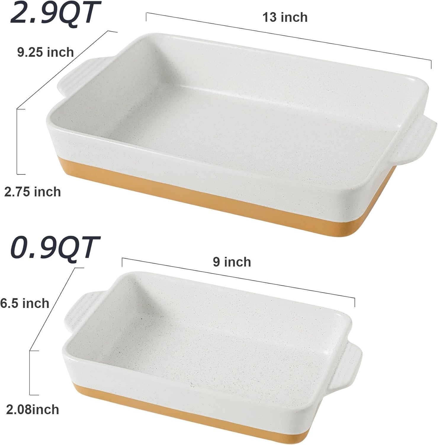 Suitable Size For Daily Use-The Howise Ceramic Baking Dish Set includes 2 pieces bakeware of difference dimensions (excludes the ears’ size): 13″L x 9.25″W x 2.75″H and 9″L x 6.5″W x 2.08″H, suitable for lasagna, spaghetti, chicken, meat, beef, roasting, vegetables, storing and reheating leftovers and etc.