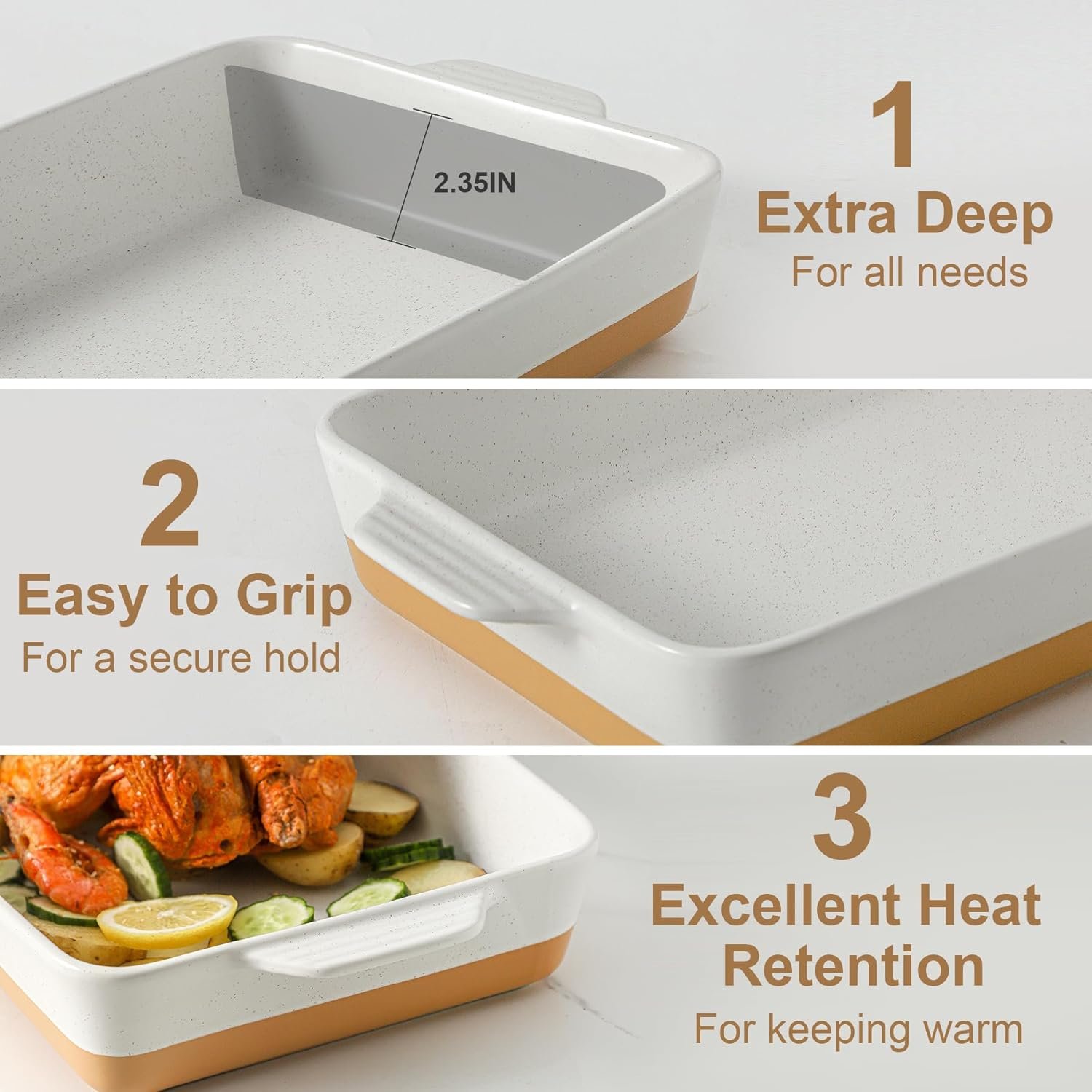 Stylish Design with Handles — Designed with special anti-slip lines on double handles, the square baking pan is easier to hold or carry from oven to countertop or from kitchen to dining table. Vintage and elegance color combines with the triple line on the dish body, making this deep baking dish never get out of style.