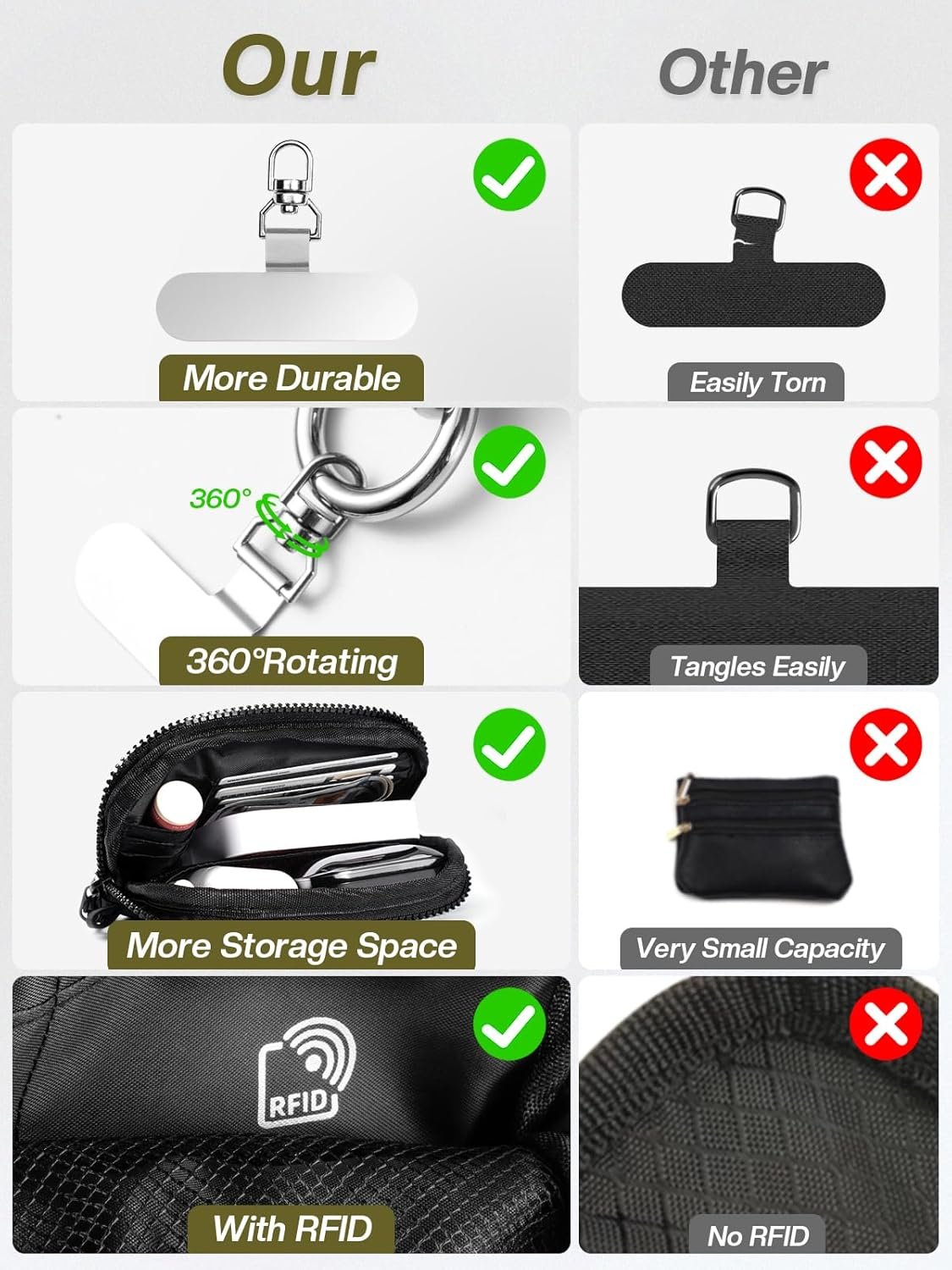 Design Craftsmanship: This clip and go phone strap with wallet has exquisite workmanship, we have paired it with 2 pcs ultra-thin 0.3mm alloy aluminum tabs, it will not hinder the normal charging of your cell phone during use. the joint features nylon connecting cloth, which is not easy to fray and is more durable, the unique D-shaped metal ring design ensures you can DIY any object on this phone strap, the ID window-fixing strap design prevents your ID card from shifting and ensures visibility.