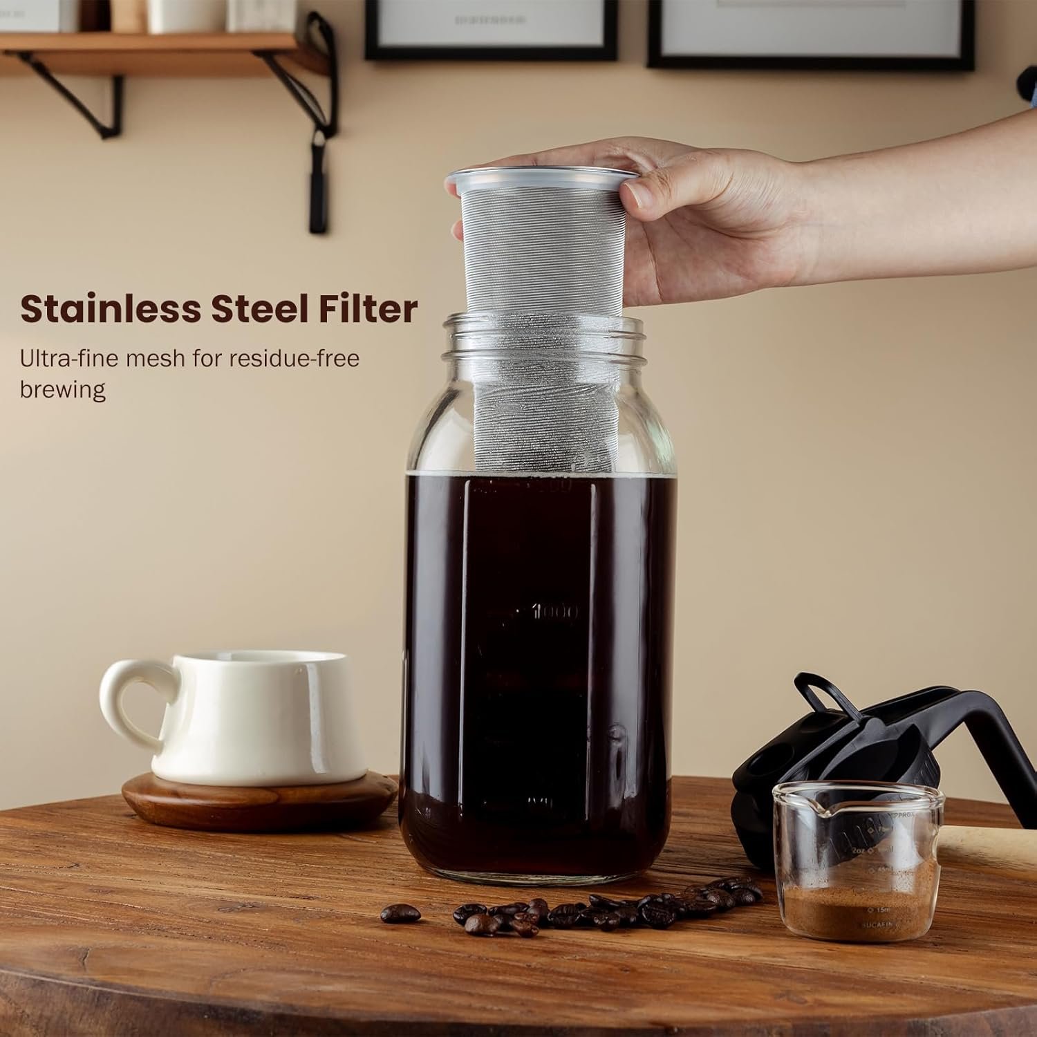 COMPLETE SET: Includes a durable glass mason jar, fine-mesh stainless steel filter, airtight lid with pour spout, and cleaning brush for easy maintenance