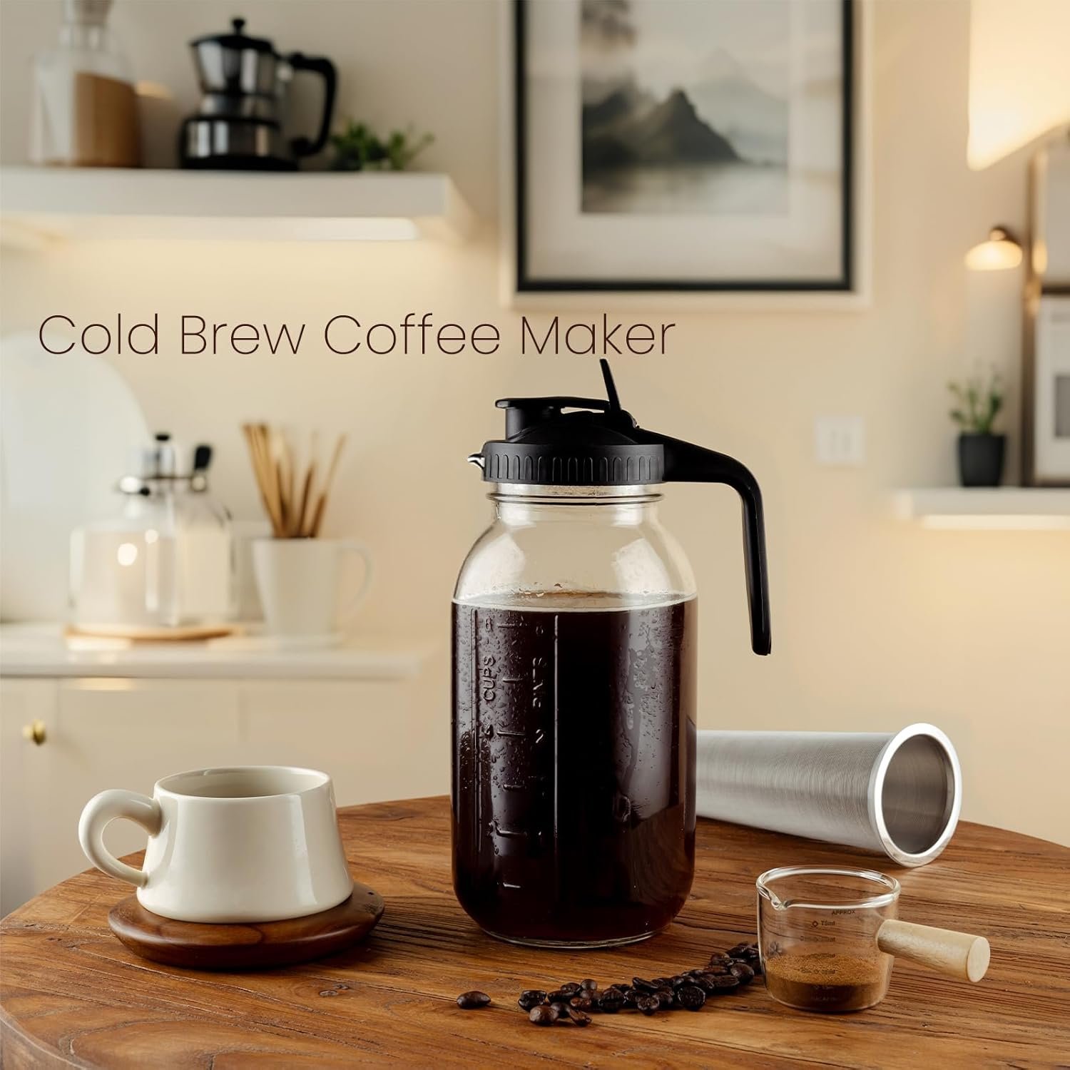 Cold Brew Coffee Maker, 64 oz Glass Pitcher with Mesh Filter, 2 Quart Mason Jar with Lid