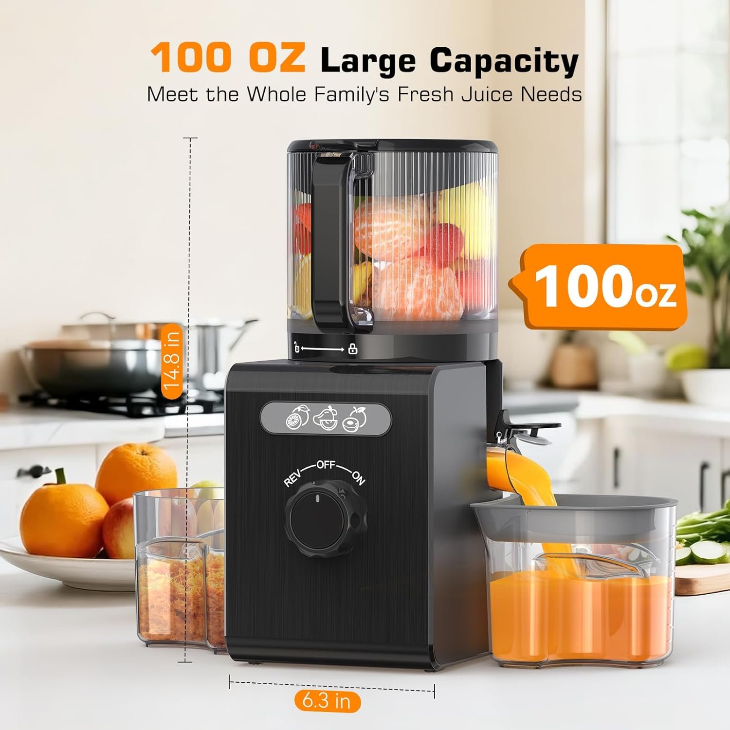 100oz Large-Capacity Hopper – Our juicer machines fit a full batch of produce in one go! Let it juice while you tackle other kitchen tasks—no hovering, no extra work