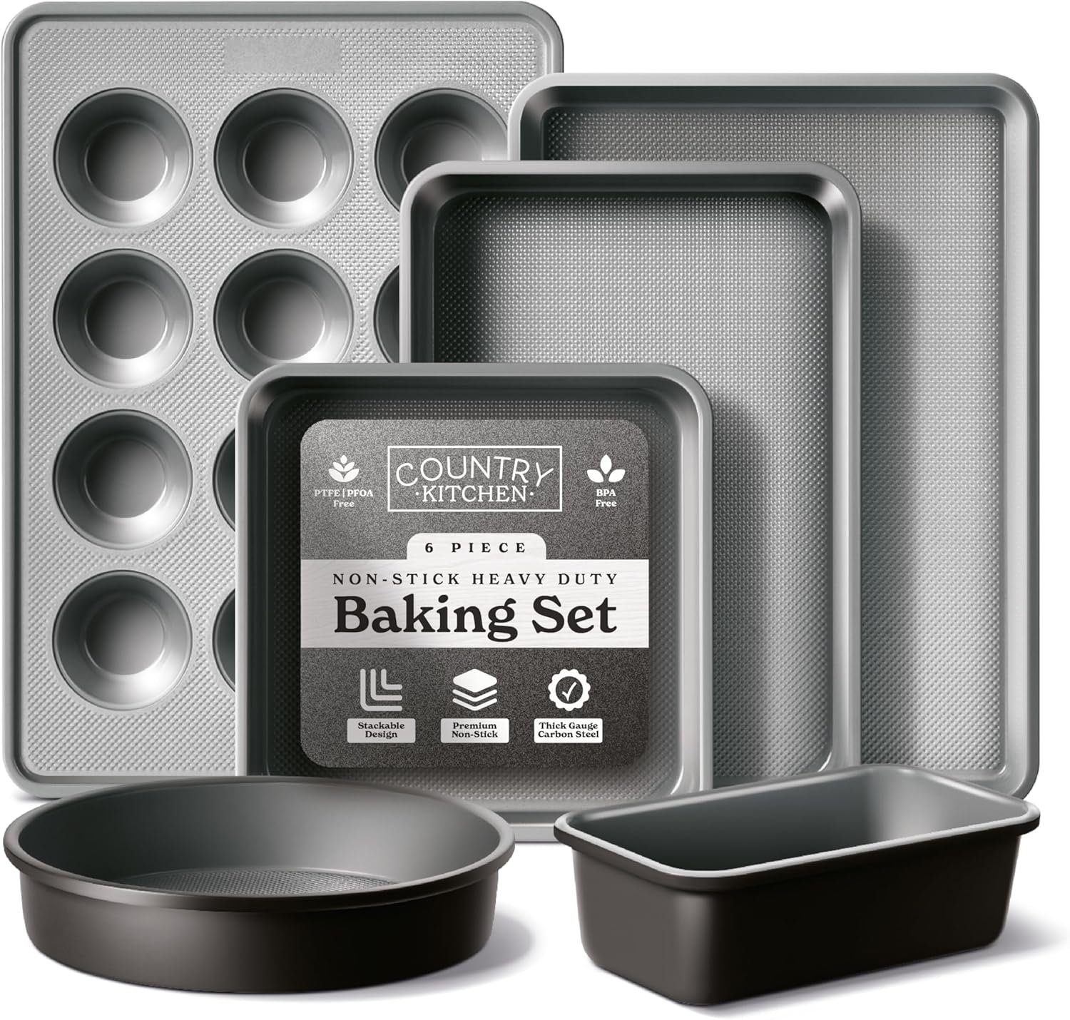 Premium Bakeware Set: Our high-quality, heavy duty bakeware set includes six pieces, each designed for durability and performance. These baking sets offer a superior nonstick silicone coating, great for effortless food release and easy cleaning, making them ideal for the home cook