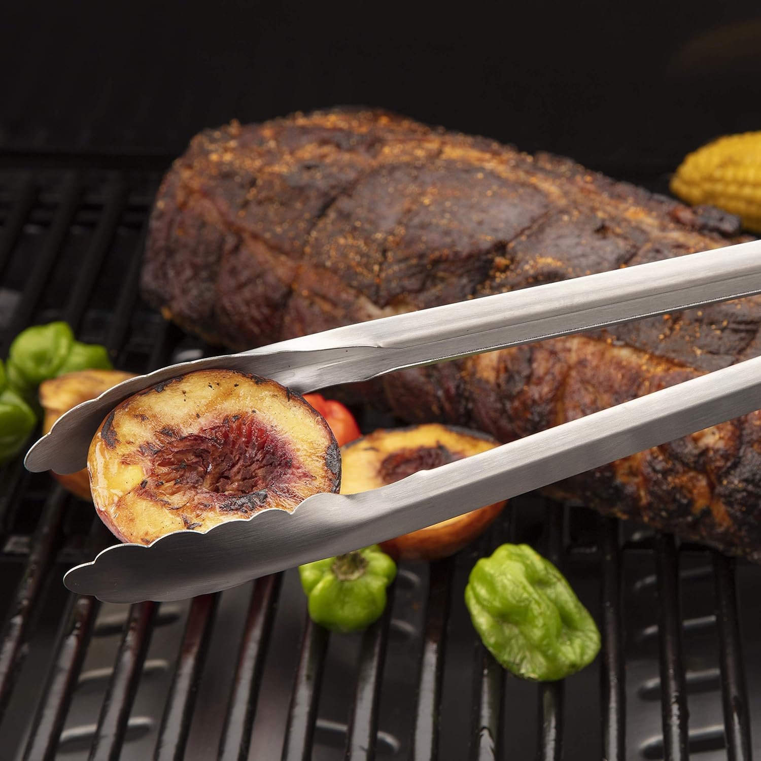 These are the ideal tongs to use while grilling. The 16″ reach will allow you to safely & comfortably turn, lift, & remove food from the grill. The steel tongs make it easy to grab even the most difficult of grilled foods while the silicone accents give you a better grip on the tongs. The hanging loop makes these great for hanging by the grill & combined with the locking mechanism, these tongs will hardly take up any space during storage. These tongs are the perfect complement to any other barbecue tools you’ll need when out by your grill. Features: Simple locking mechanism for storage|Long 16″ tongs|Silicone grips with embossed logo|Grill hanging loop|Brushed stainless steel