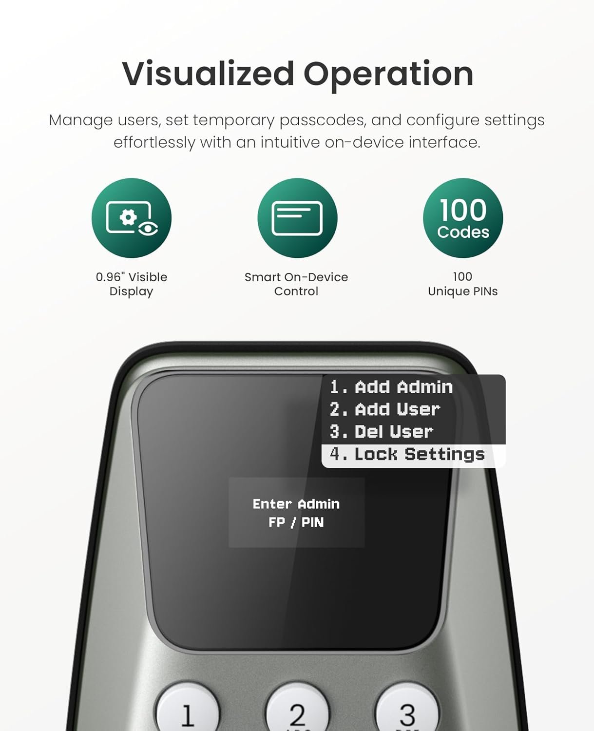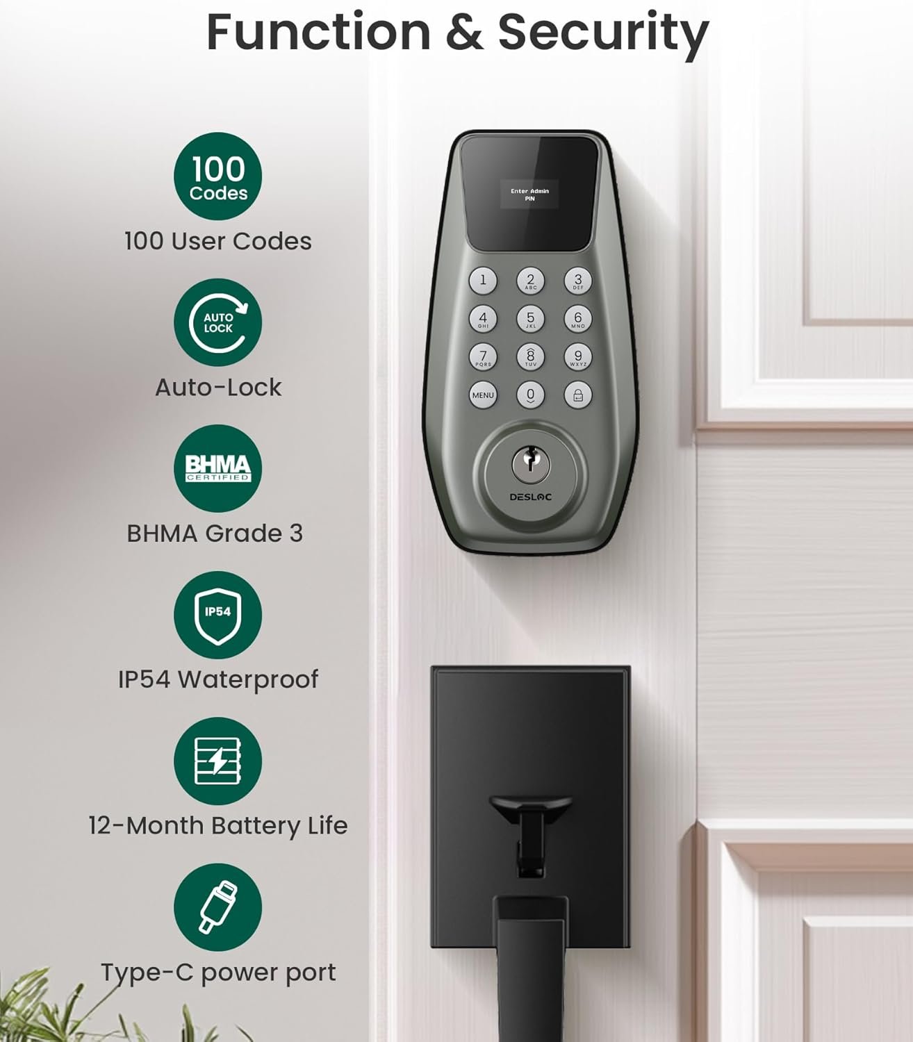 𝐏𝐚𝐬𝐬𝐜𝐨𝐝𝐞 𝐄𝐧𝐭𝐫𝐲:Secure keyless entry for your front door with DESLOC C100 keypad deadbolt lock. Program up to 100 user PIN codes for family, roommates, cleaners, and staff, plus 4 one-time codes that auto-expire after use—ideal for Airbnb door lock, rentals, deliveries, and temporary access without keys