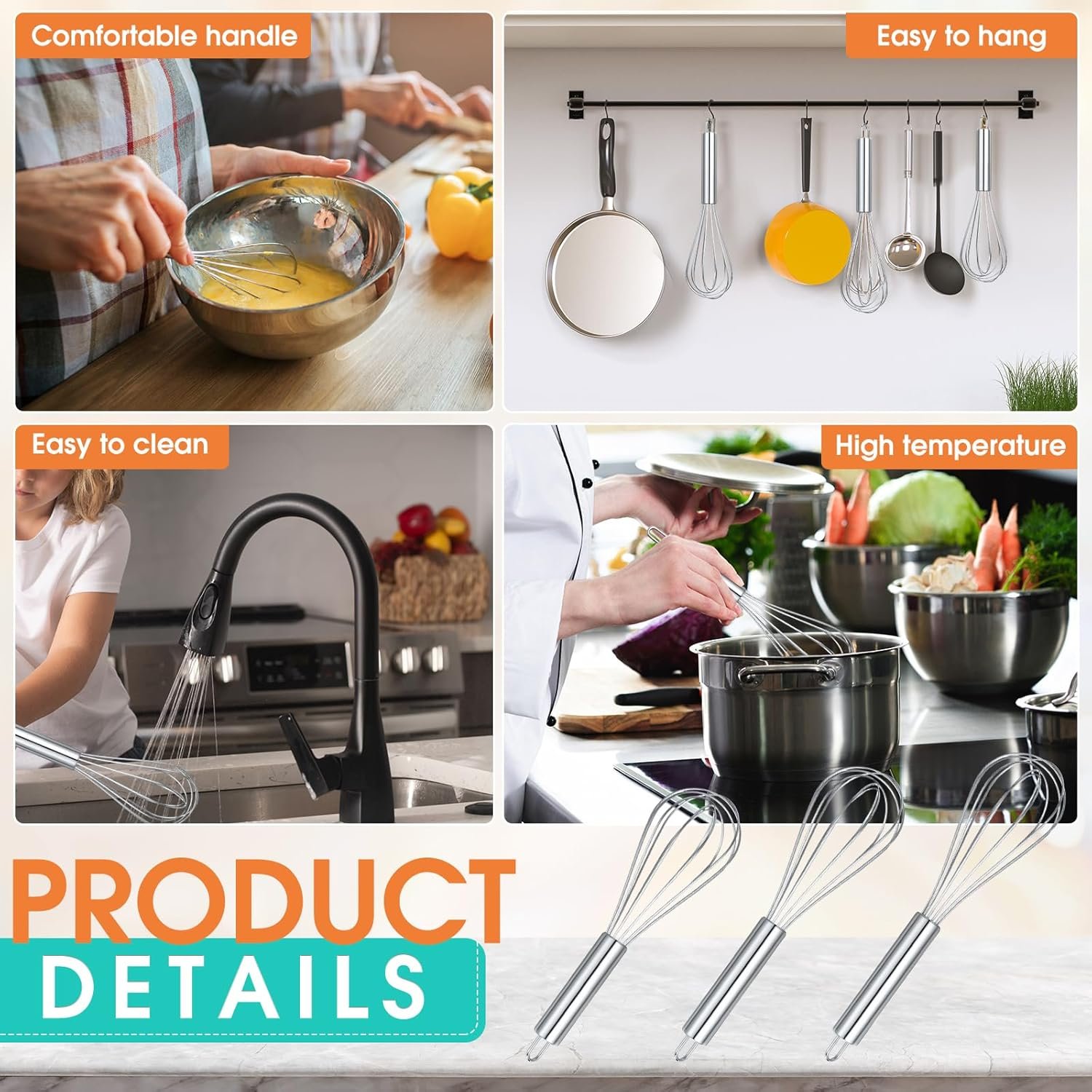 Reliable Material: our kitchen whisks set is made of sturdy stainless steel wire which coated. Easy to use and won’t scratch any of your pots, pans, bowls or other dishes while using it, you can confidently use these whisks for a long time