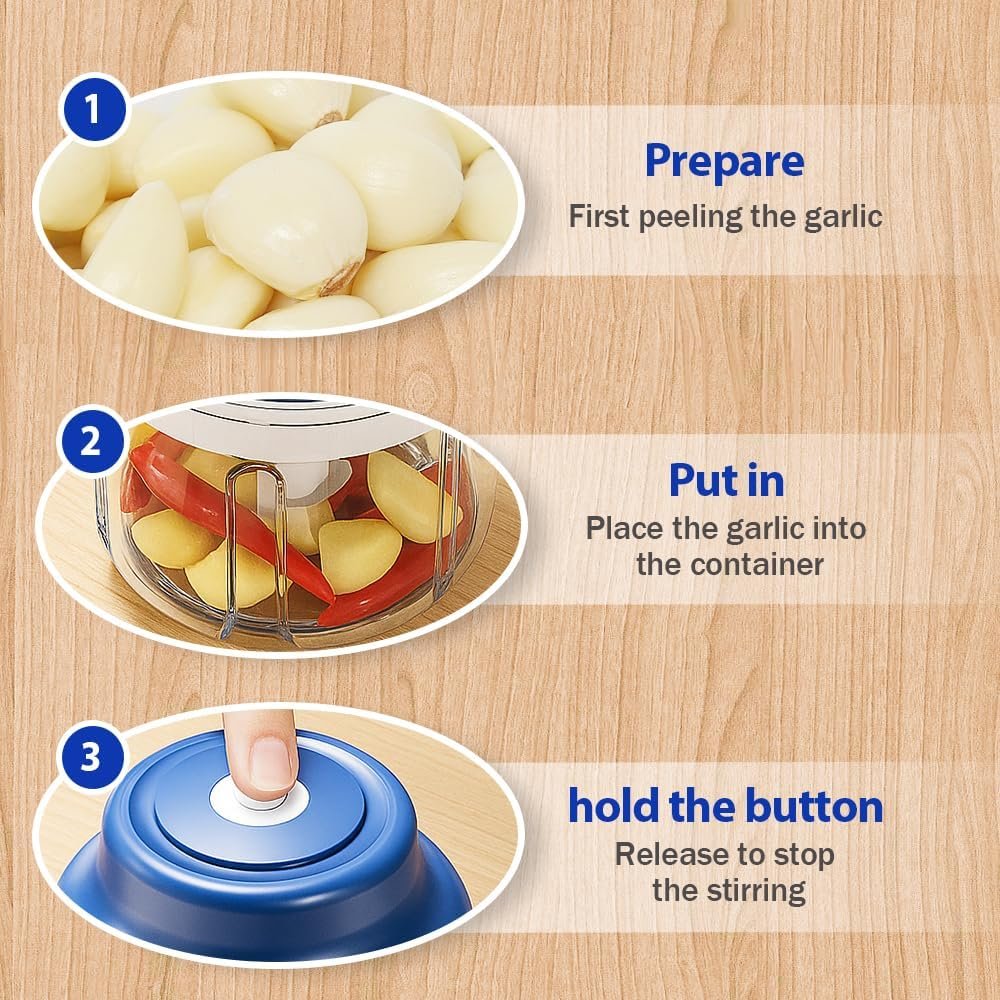 One-Touch Electric Operation: Effortlessly chop garlic, onions, and herbs in seconds with a simple press of the button, eliminating manual chopping and strong odors on your hands