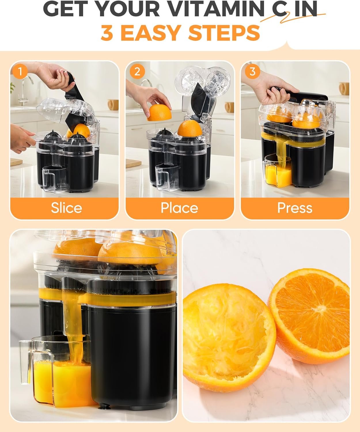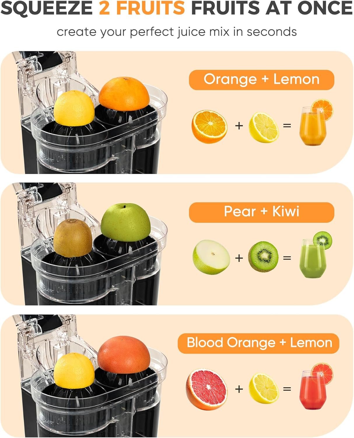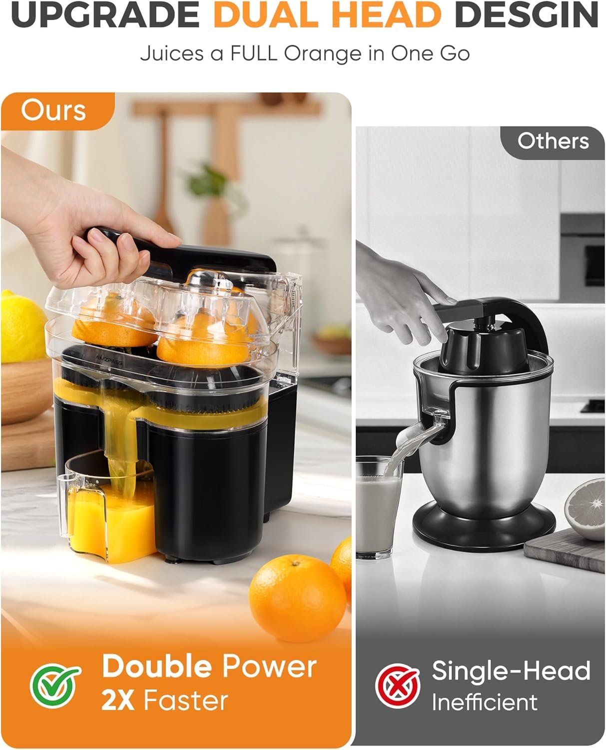Dual-Head, 2X Faster Juicing: Our dual-head orange jucier allows you to juice whole fruits in one go or create fresh mixed juices by pressing two different fruits simultaneously. The powerful 200W motor extracts more juice from whole fruits, giving you faster, higher-yield juicing with every press