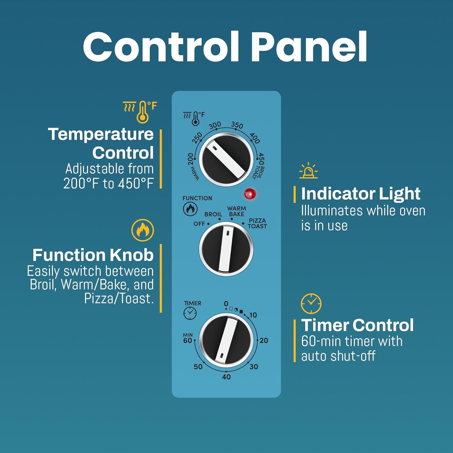 ADJUSTABLE TIMER: The oven includes a 60-Minute timer with indicator bell and toast shade settings.