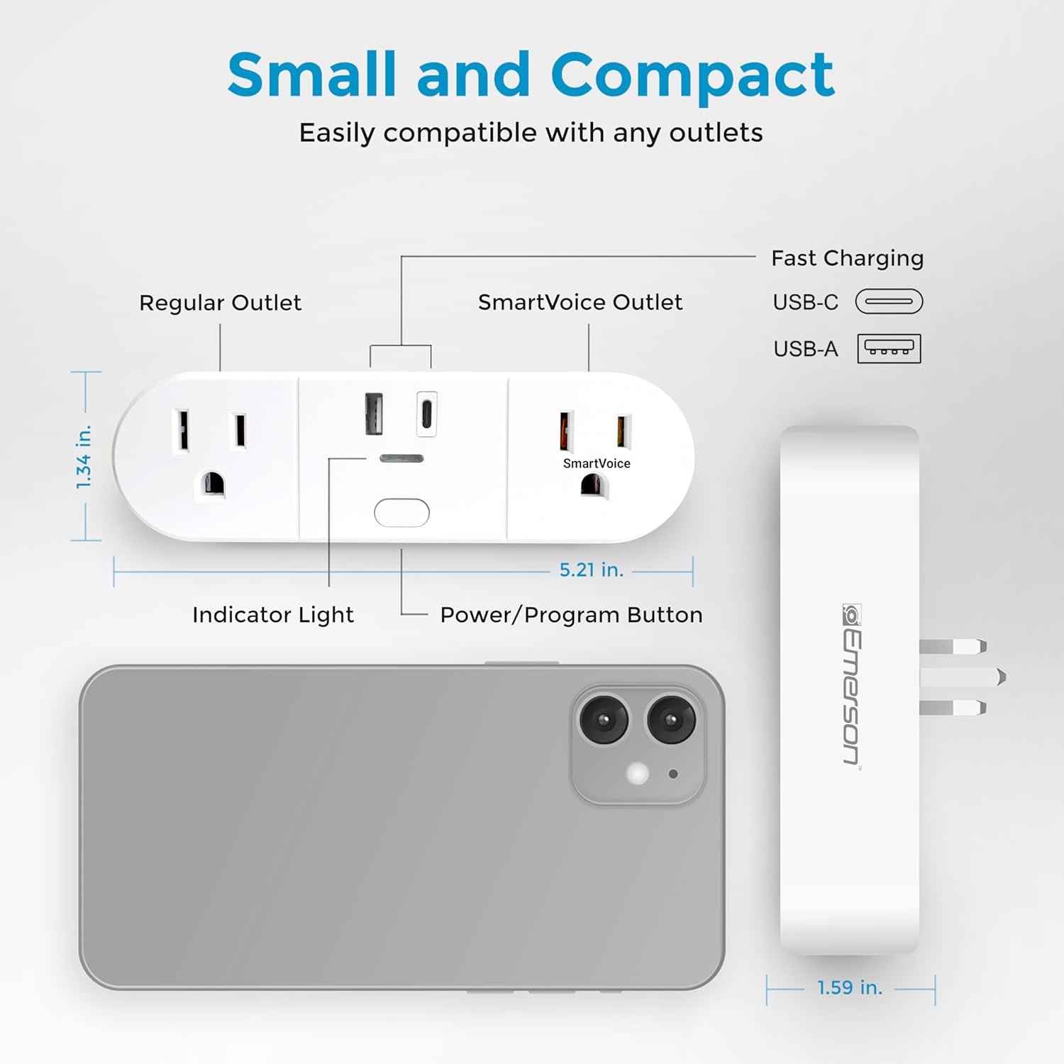 Emerson SmartVoice 4-in-1 Wall Plug, Offline 30+ Voice Control Commands, No APP, No WiFi, No Setup, Smart Outlet w/ 2 AC Outlets, USB-A & USB-C Ports, Sleep & Wake Timer, ETL