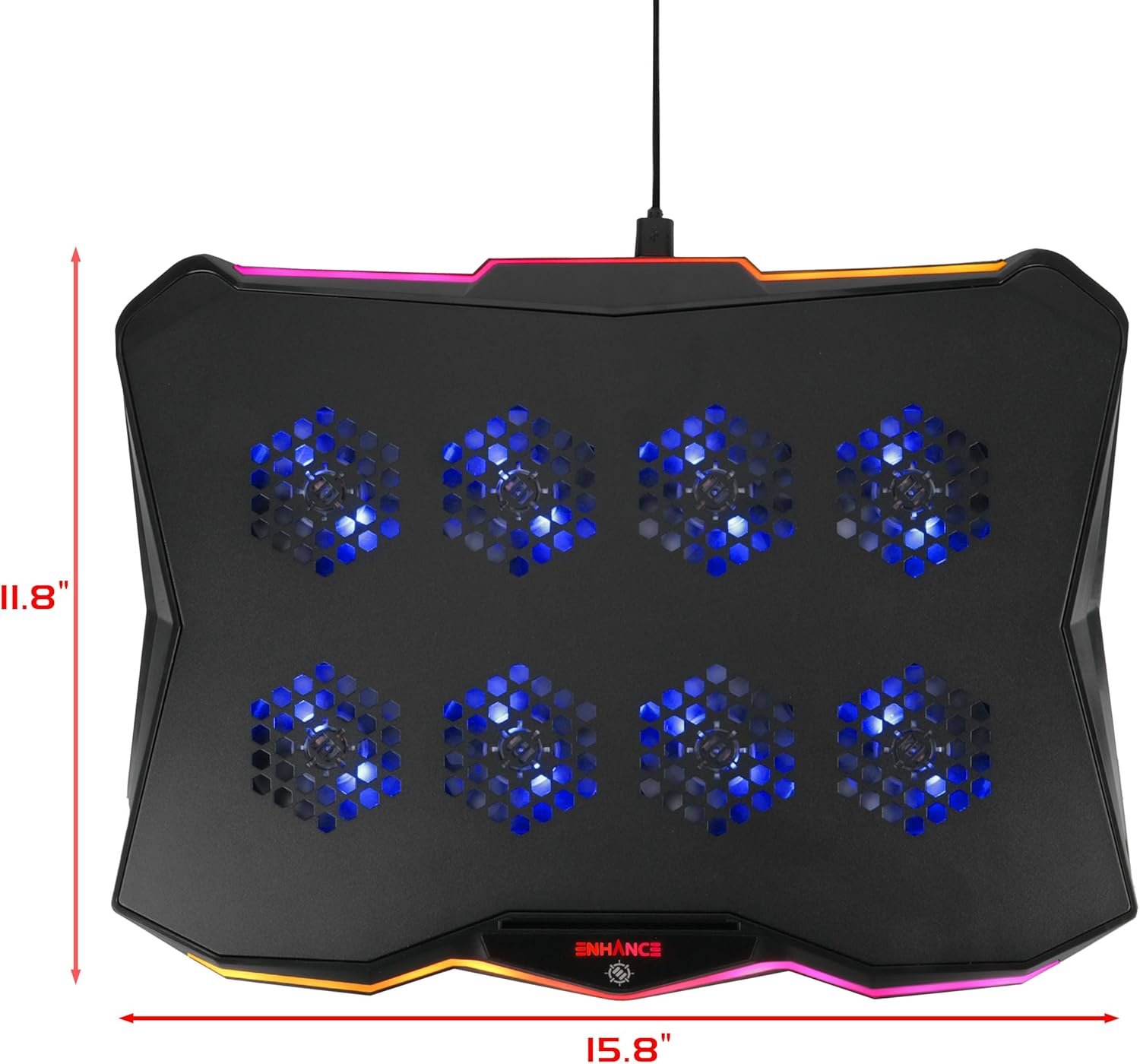 Stop Losing Games to Overheating Transform your gaming experience with the ENHANCE Infiltrate 3 Gaming Laptop Cooler. Engineered with advanced Cryogen Technology and a precision-machined hexagon metal plate, this cooling laptop stand eliminates thermal throttling.Professional-Grade Cooling PerformanceEight whisper-quiet 70mm fans spin up to 3000 RPM, delivering 79 CFM of targeted airflow directly to your computer laptop’s critical components. This isn’t just cooling – it’s performance insurance for your processor and graphics card, helping maintain consistent clock speeds when the action gets intense.Game-Changing ConvenienceSetup takes seconds. Connect via the included braided USB-A cable, adjust your preferred angle from seven ergonomic positions, and dial in your perfect laptop cooling fan speed and RGB lighting combo from ten stunning effects.Built for Gaming WarriorsAt just 1 inch thin and 2.2 pounds, the Infiltrate 3 disappears into your gaming bag but delivers heavyweight cooling performance. The slide-lock bracket system and rubber grips secure laptops from 13 to 17.3 inches, including popular gaming models from Dell, HP, ASUS, Acer, and MSI.Your Competitive EdgeWhether you’re climbing ranked ladders, streaming for hours, or pushing through marathon gaming sessions, consistent cooling means consistent performance. This laptop stand with fan technology doesn’t just prevent overheating – it preserves your competitive advantage when victory depends on every frame.Quality You Can TrustConstructed with premium materials and backed by rigorous testing, this cooling fan for laptop systems is built to withstand the demands of serious gaming. Multiple cooling pads simply can’t match this level of engineering precision. Keep your system cool, your performance peak, and your games smooth with the cooling solution that serious gamers choose.