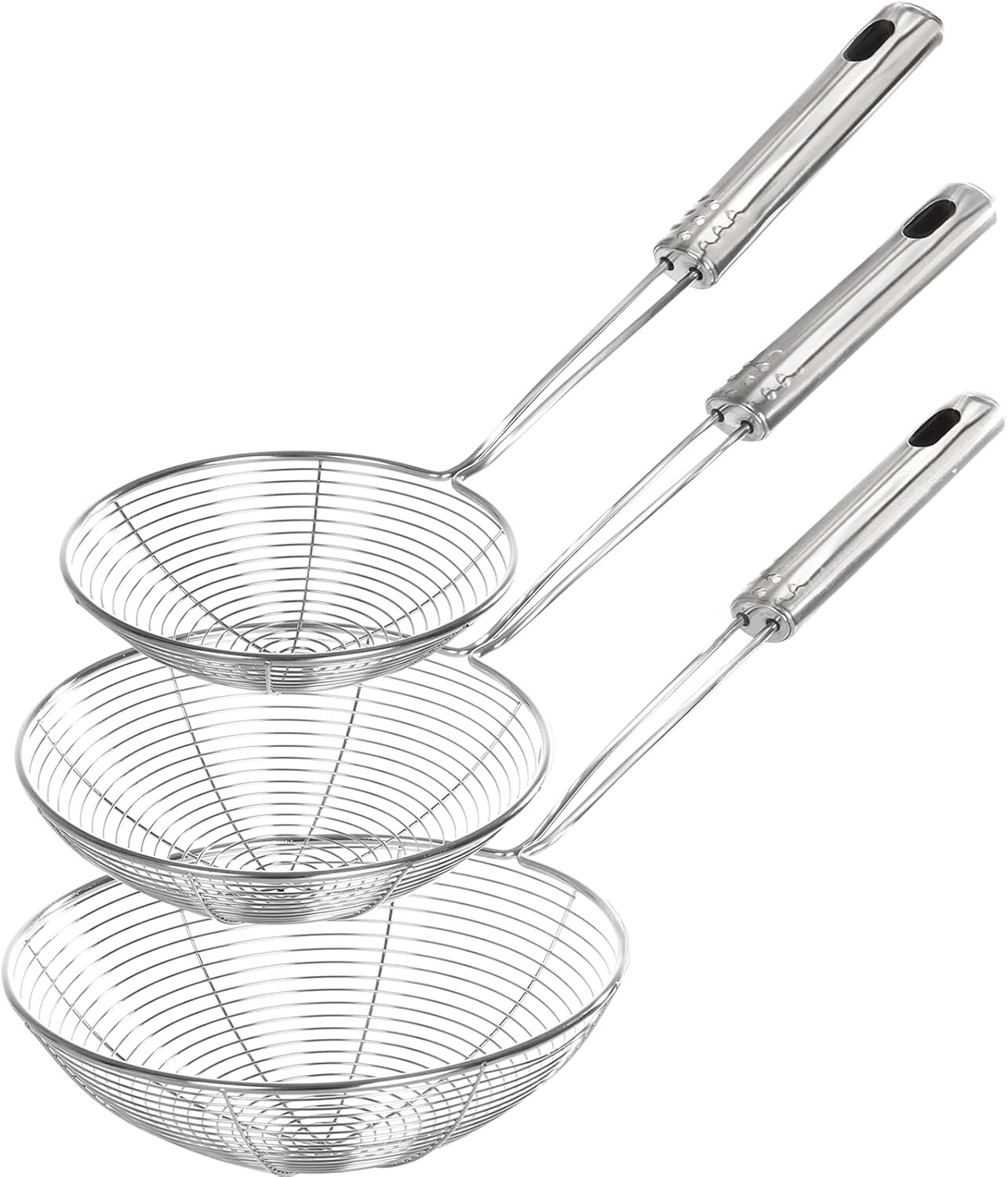 Enhanced Version Stainless Steel Spider Strainer Skimmer Ladle, Set of 3 Sizes Kitchen Strainer Spoon for Cooking and Frying, Pasta Strainer, Food Preparation-32.5cm, 36cm, 38cm