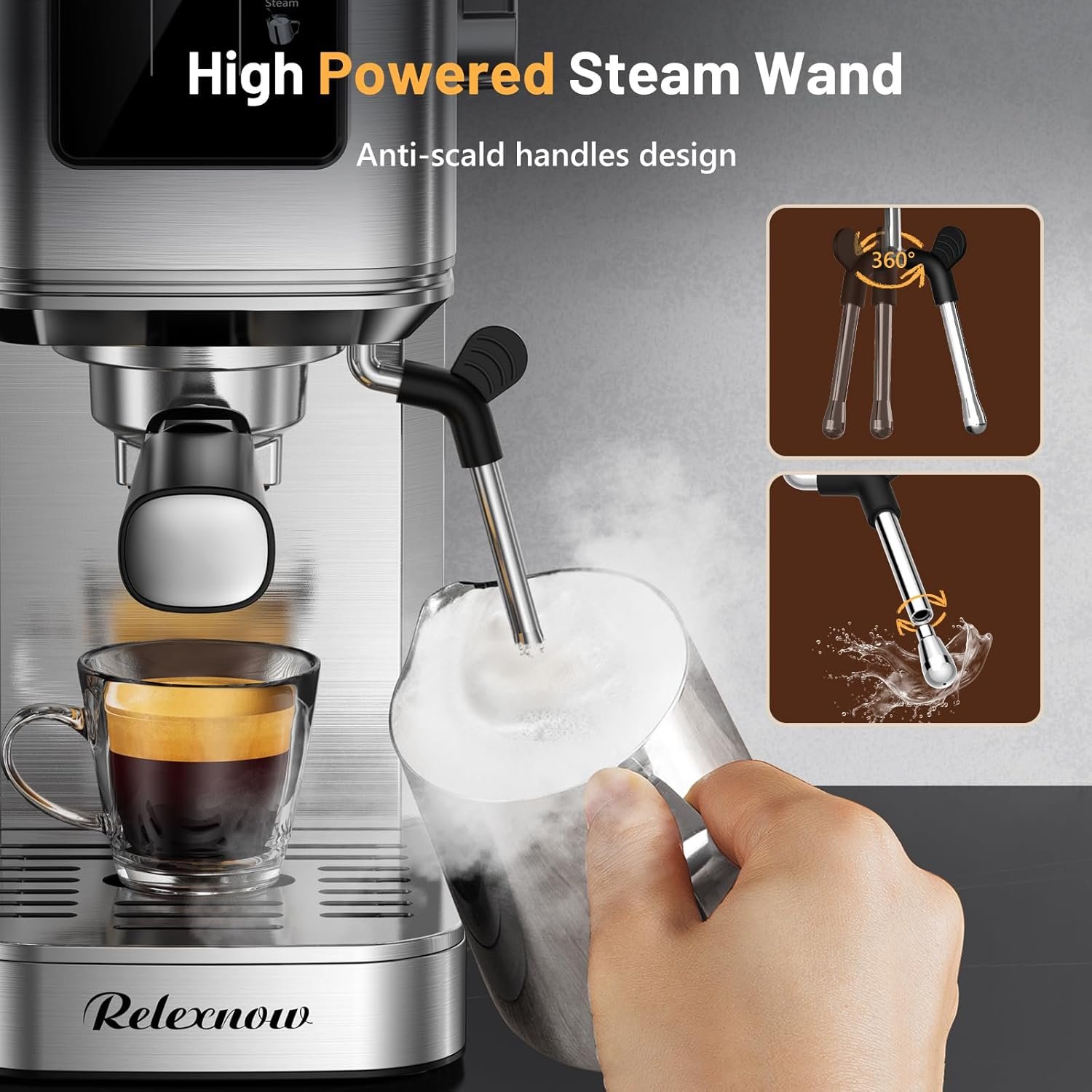 Enjoy Espresso Coffee At Home: The RELEXNOW coffee machine with milk frother allows you to make all your favorite espresso-based coffees.You can enjoy a barista-brewed latte, cappuccino or macchiato at home.Stainless steel appearance, stylish and durable, ideal for any size kitchen.This compact espresso coffee maker is perfect for birthday presents, Christmas presents, mom presents, dad presents and wife presents.