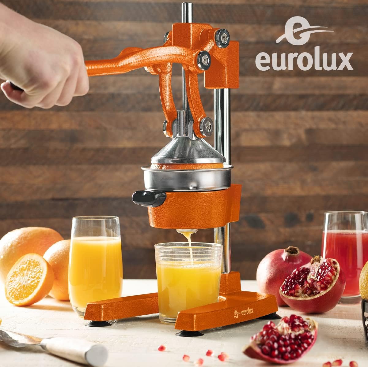 Eurolux Cast Iron Citrus Juicer | Extra-Large Commercial Grade Manual Hand Press | Heavy Duty Countertop Squeezer for Fresh Orange Juice (Bonus Stainless Steel Cup) (Orange)