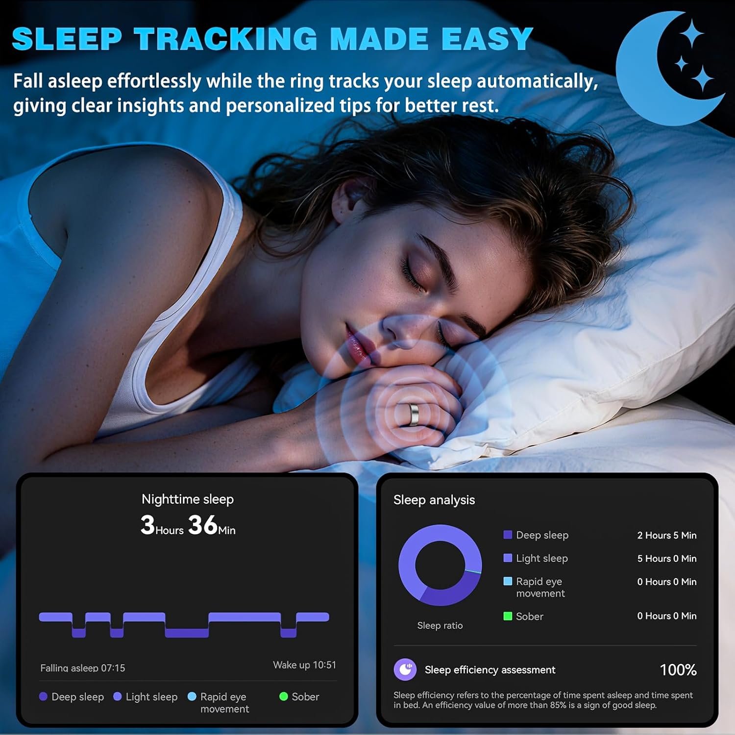 【Sleep Tracking Ring】: Ultra-thin and lightweight, this smart health ring tracks your sleep effortlessly without feeling bulky. It automatically monitors your total sleep time, deep sleep, light sleep, REM, and awake periods. View detailed sleep stages in the app and make informed adjustments to your lifestyle