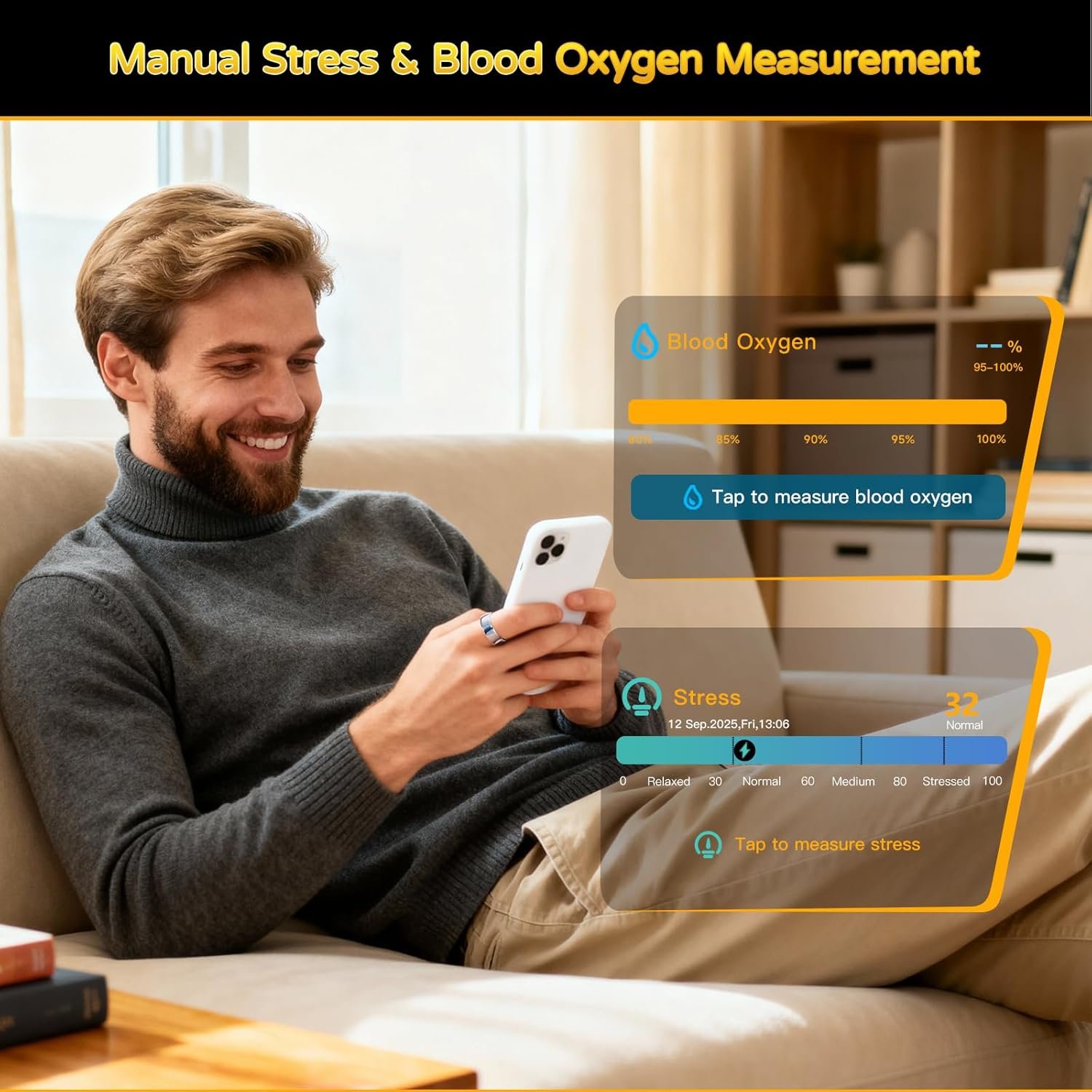 Activity Fitness Tracker: The fitness tracking ring records exercise data and automatically monitors your heart rate and HRV every half hour, or you can do it manually via the app. Blood oxygen saturation and stress tests are measured manually via the app
