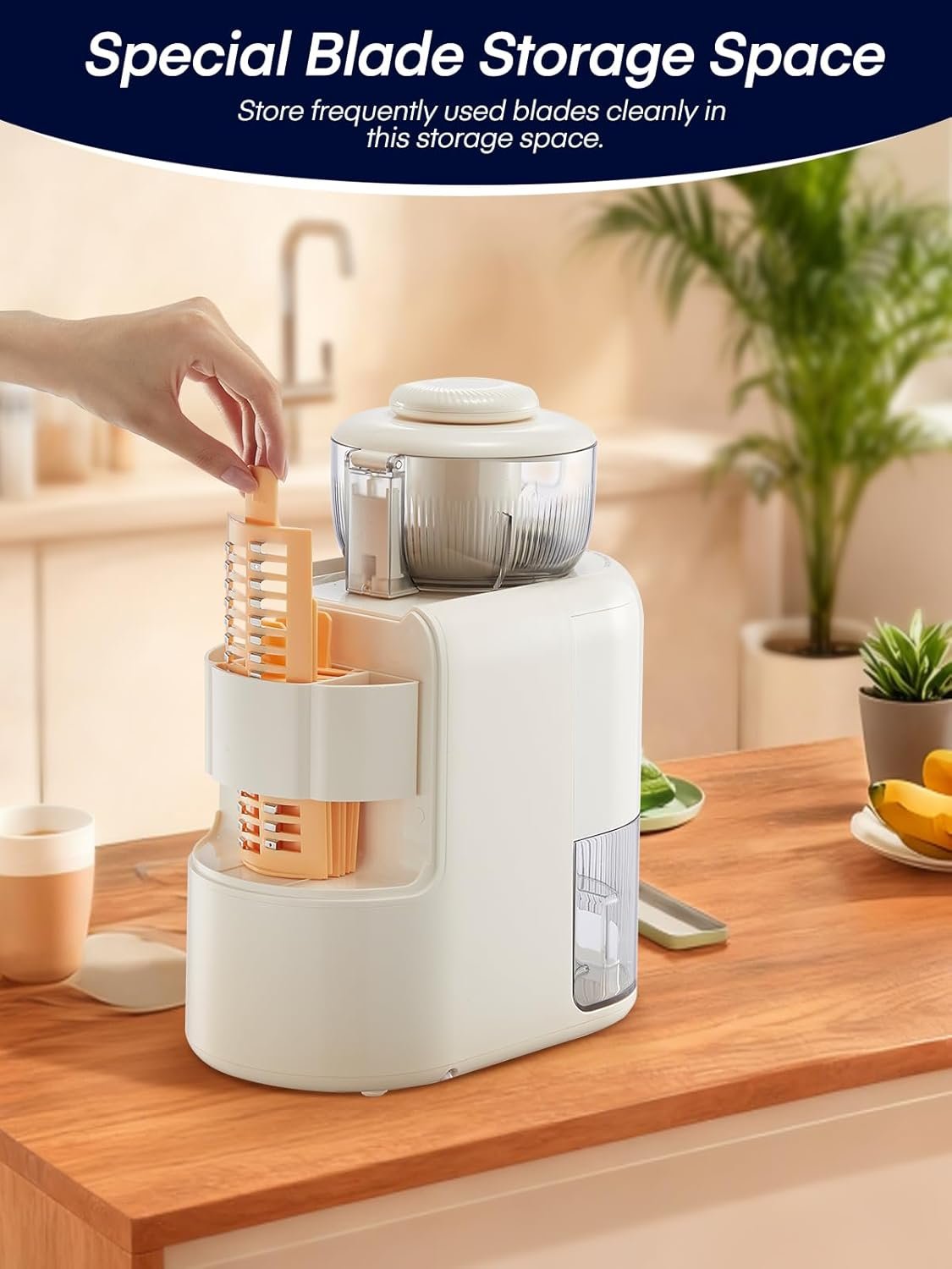 【User-Friendly Design】 The unique blade storage compartment in this rotary cheese grater keeps blades organized and clean. Storing blades which used frequently in the compartment for instant access and maximum convenience.In addition, the grater includes a 1.8-liter large-capacity container, preventing vegetable splatters on your countertop. Comes with a food pusher to assist in pressing ingredients down.