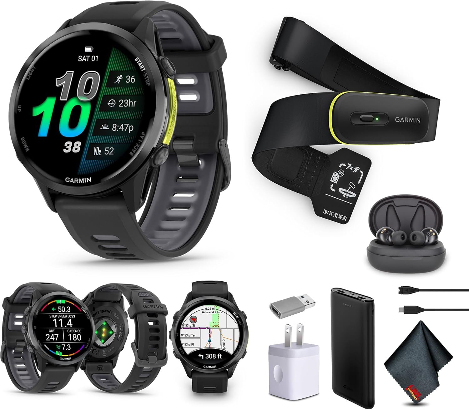 Bundle Includes: Garmin Forerunner 970 Running Smartwatch, GPS Fitness Smart Watch For Men And Women, Carbon Gray DLC Titanium with Black Case and Black/Translucent Whitestone Band + Garmin Access 600 Fitness Monitor, XS-S + USB Wall Plug Charging Adapter Cube + USB3.0 to type-c female adapter Space Gray + Microfiber Cleaning Cloth + P-Bank + Air Pro TWS Truly Wireless EarBuds – (Color may vary)