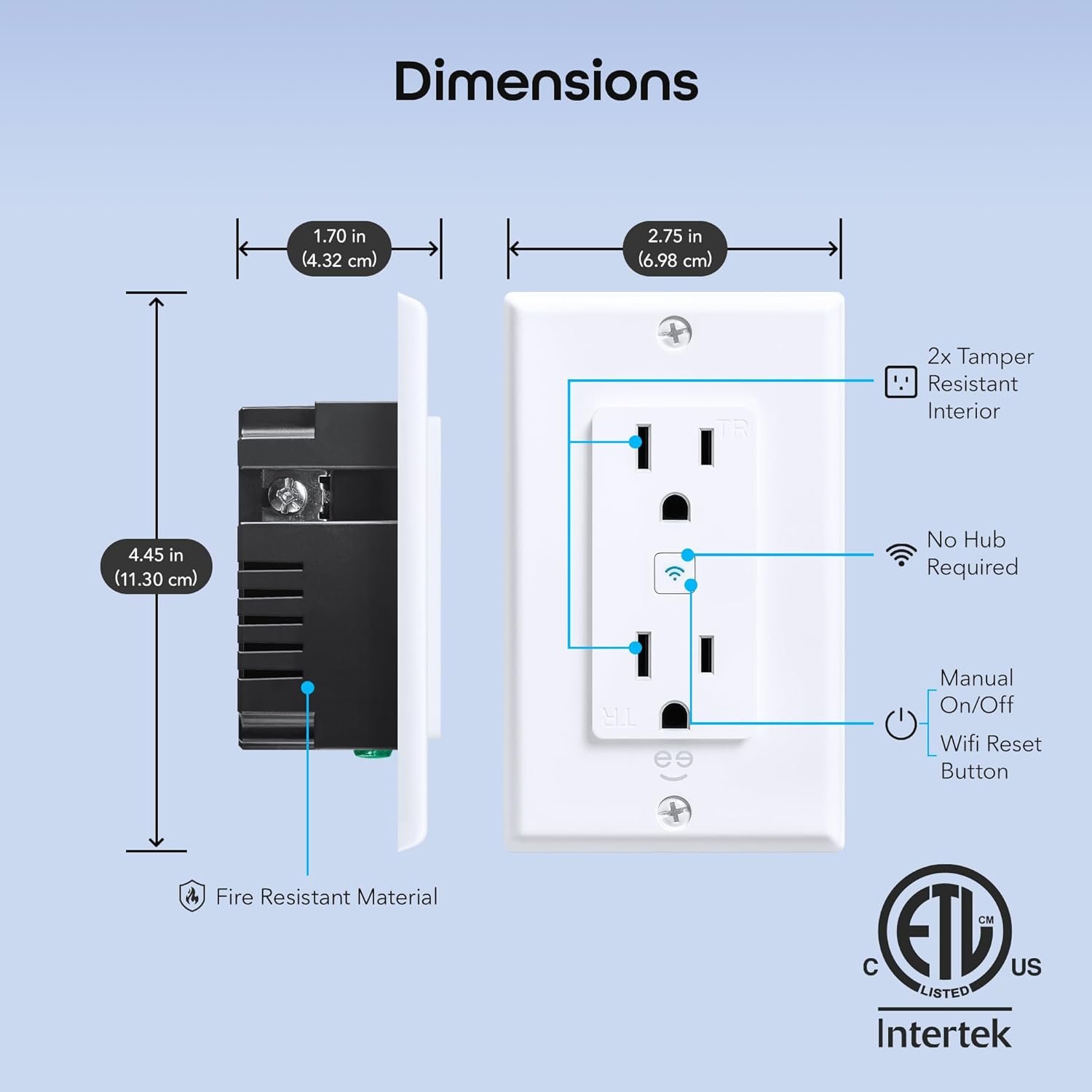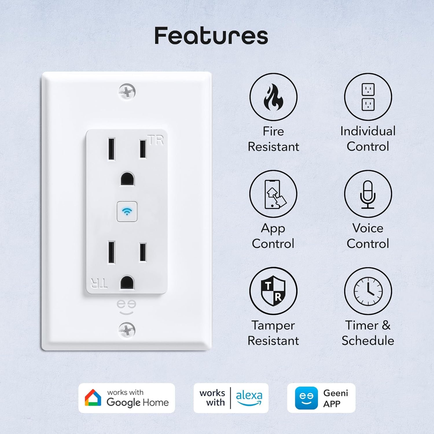 Dual Tamper-Resistant Outlets – Each in-wall unit includes 2 individually controlled smart outlets with added safety for kids and pets.