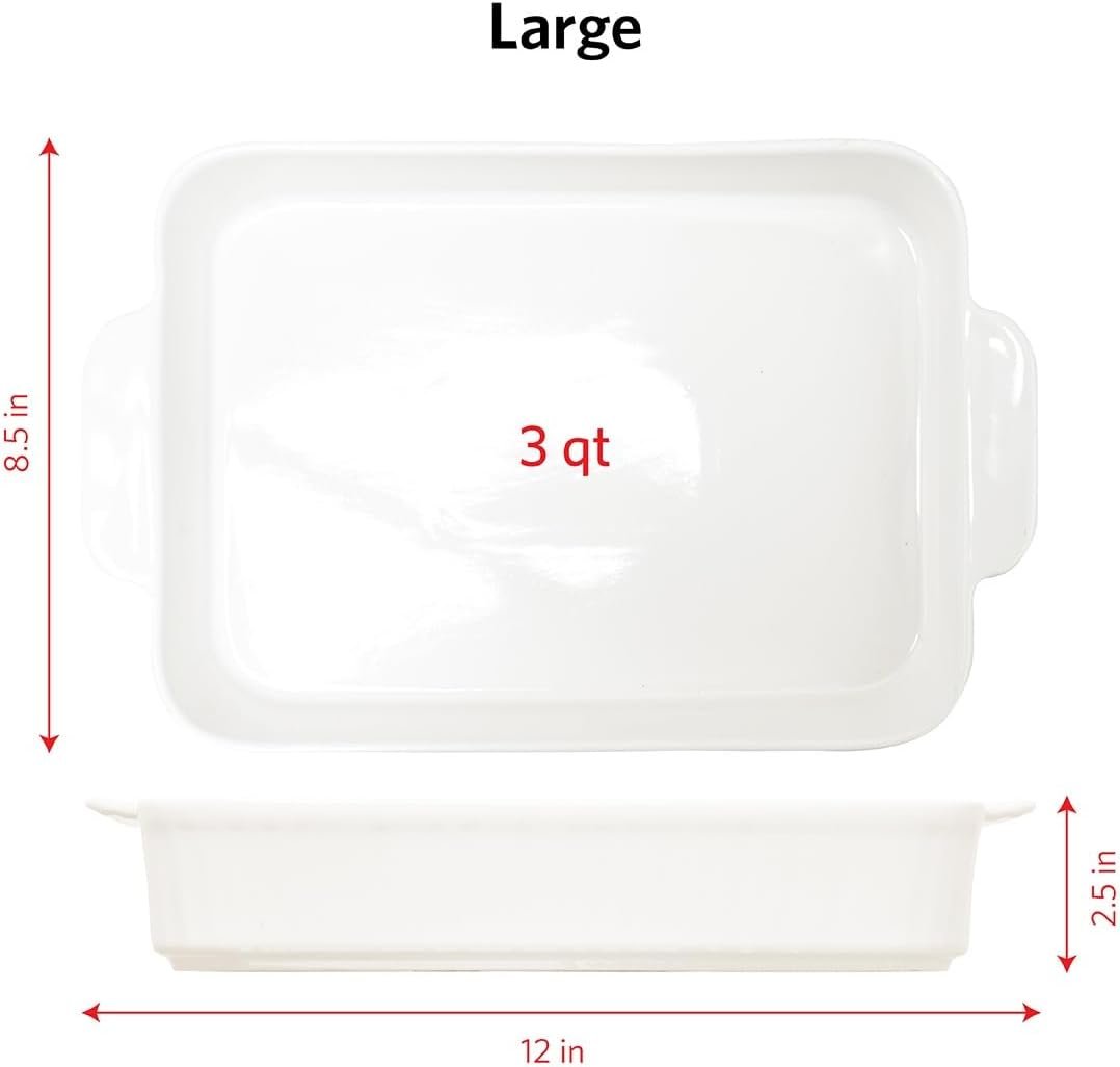 THREE SIZES FOR EVERY OCCASION: Includes 12” x 8.5” (3 quart), 10.5” x 7.5” (2 quart), and 8.5” x 6” (1 quart) stoneware dishes. The assorted sizes are perfect for baking main courses, sides, and dessert.