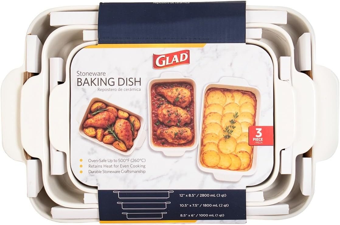 Glad Baking Dish Set, 3pc – Rectangular Stoneware Casserole Dishes for Oven and Microwave – Nesting Bakeware Set with Handles (12”, 10.5”, and 8.5”), Dishwasher Safe