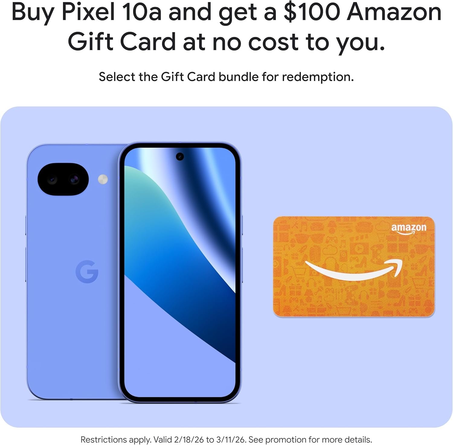 Order the new Google Pixel 10a today and get an Amazon Gift Card; valid 2/18/2026 until 3/11/2026 at 11:59pm PT, while supplies last and subject to availability