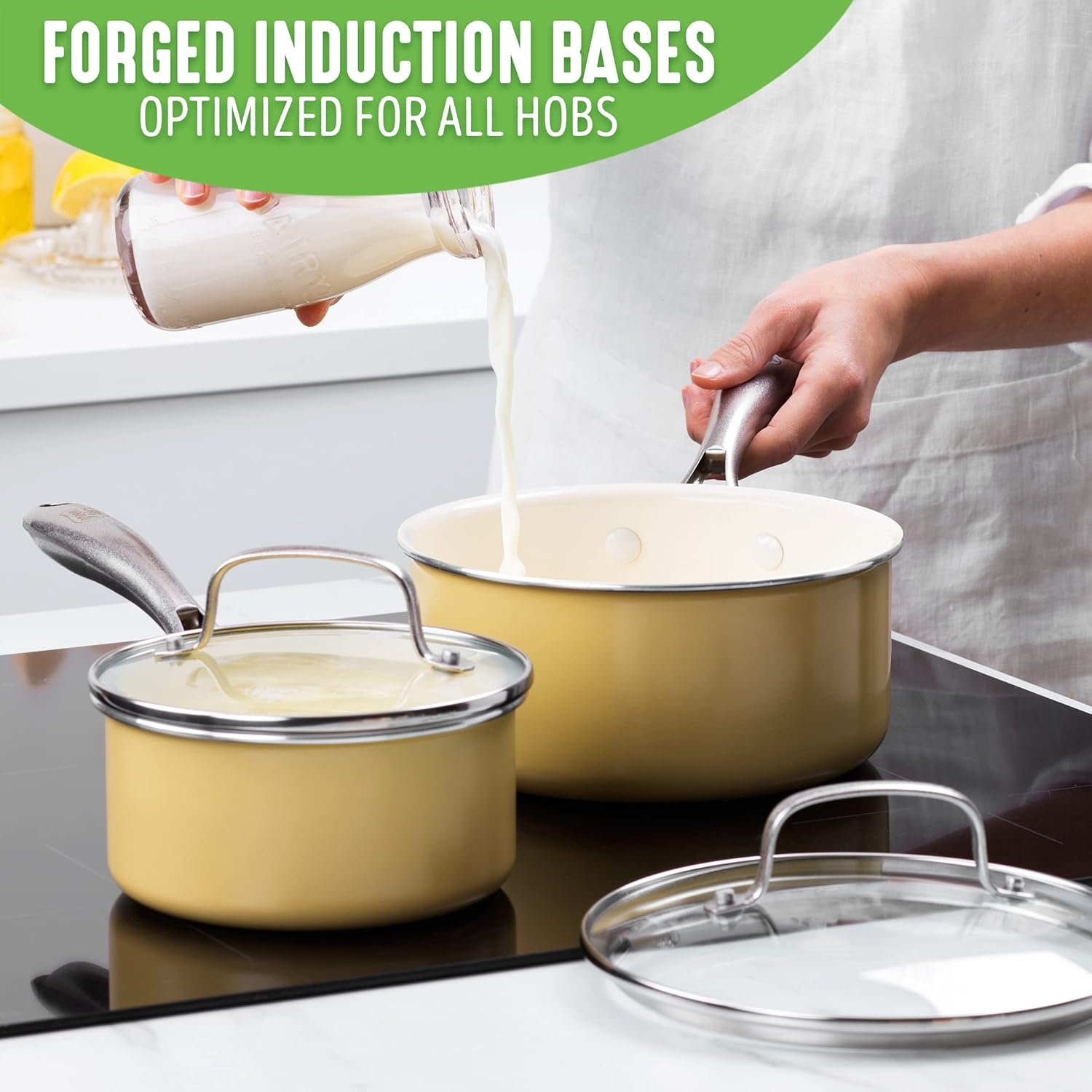 GreenLife Artisan Healthy Ceramic Nonstick, 1QT and 2QT Saucepan Pot Set with Lids, Stainless Steel Handle, Induction, PFAS-Free, Dishwasher Safe, Oven Safe, Yellow