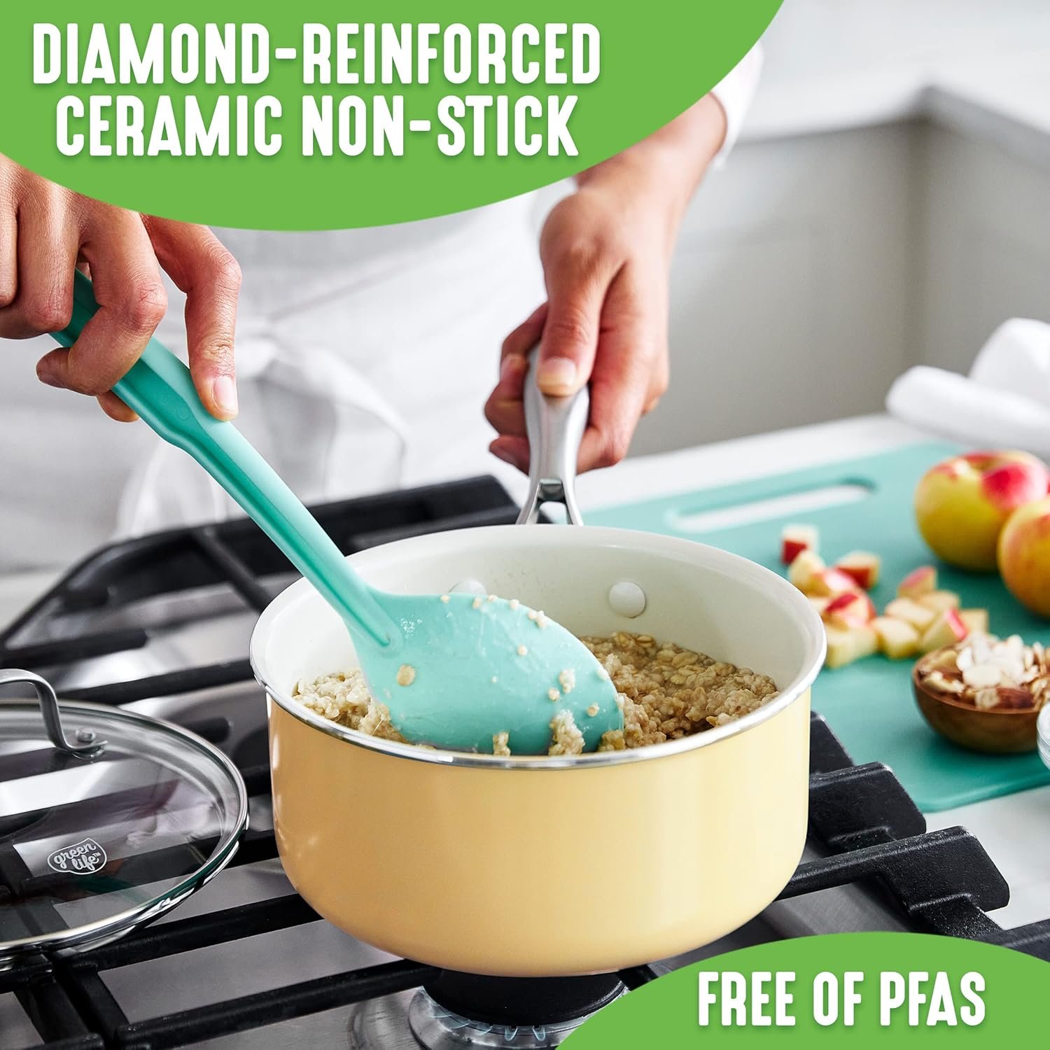 We designed the Artisan collection for chefs who are dedicated to putting masterpieces on the plate. This pair of versatile saucepans features riveted stainless steel handles to give you total control in the kitchen. Go ahead, go from stovetop to oven and back. Designed for effortless performance and cleanup, this collection features our toxin-free Thermolon nonstick coating, which is free of PFAS, PFOA, lead, and cadmium. It’s also reinforced with diamonds for incredible durability. GreenLife’s healthy ceramic nonstick is not stuck in the past—that’s why our ceramic nonstick starts with sand and creates 60% fewer CO2 emissions during the curing phase than traditional coatings. Plus, the clear glass lids give you an easy view of all the action. For all stovetops, except induction. Oven safe up to 600°F. Dishwasher safe. This cookware set includes: 1-quart conical saucepan with lid and a 2-quart saucepan with lid.