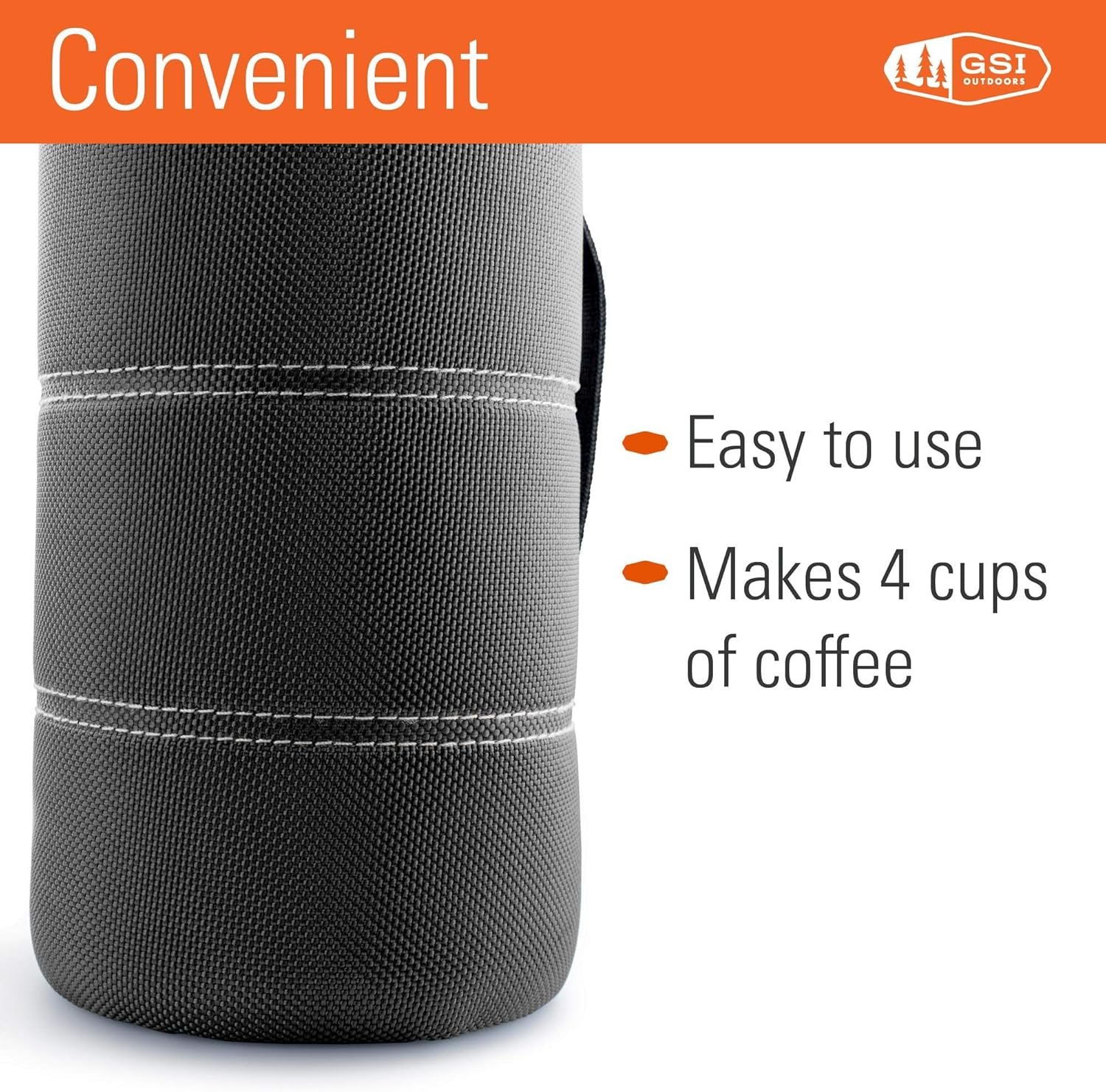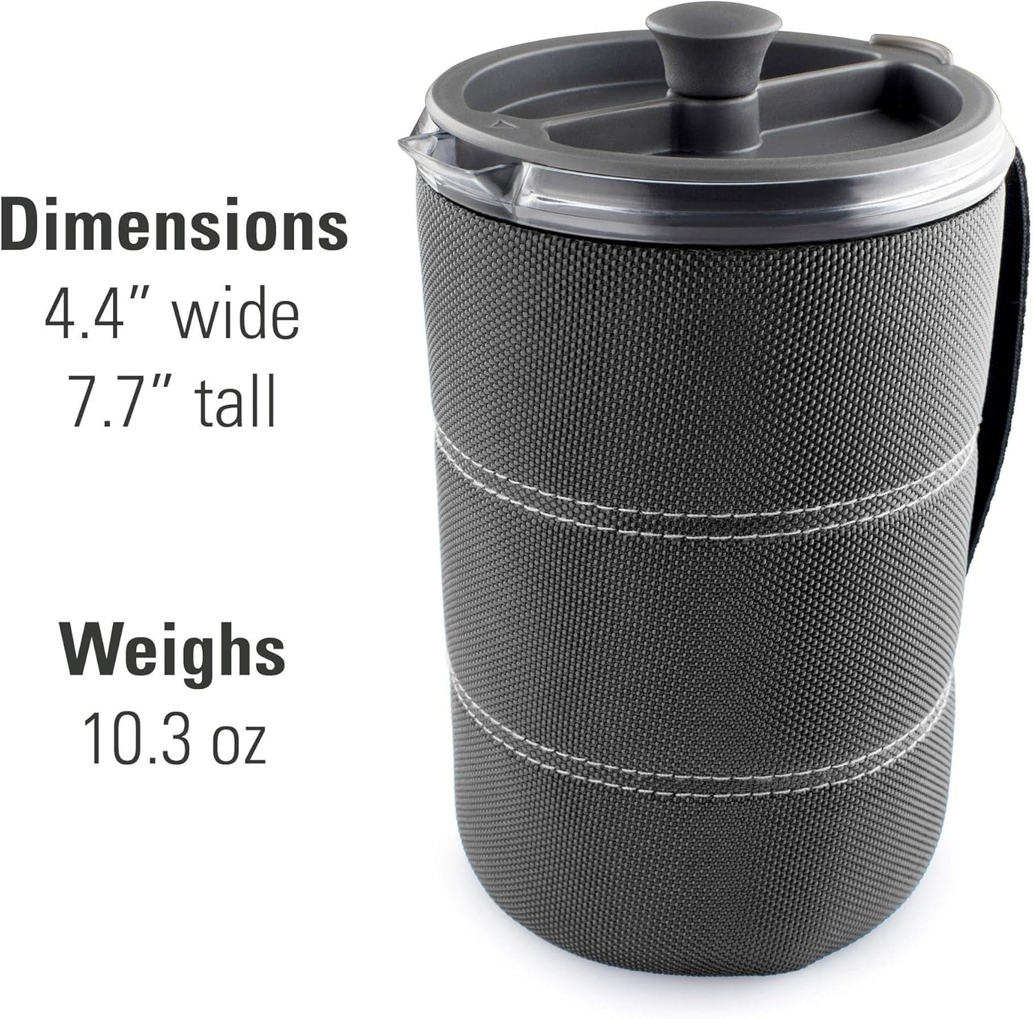 Includes a water-resistant nylon cloth sleeve with a handle, protecting your hands from the heat while helping keep your coffee as hot as you like it