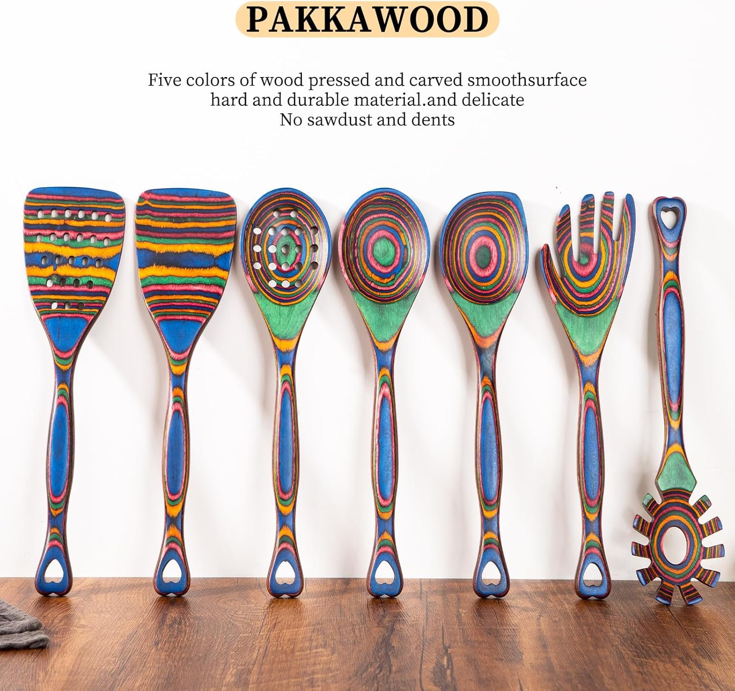 BEAUTIFUL COLORS: Pakkawood is crafted from many layers of beautiful hardwoods, infused with natural and chemical-free dyes.As is a pressure-treated, intensely heated material, it is resistant to heat, water, warp and often used in kitchen utensils set