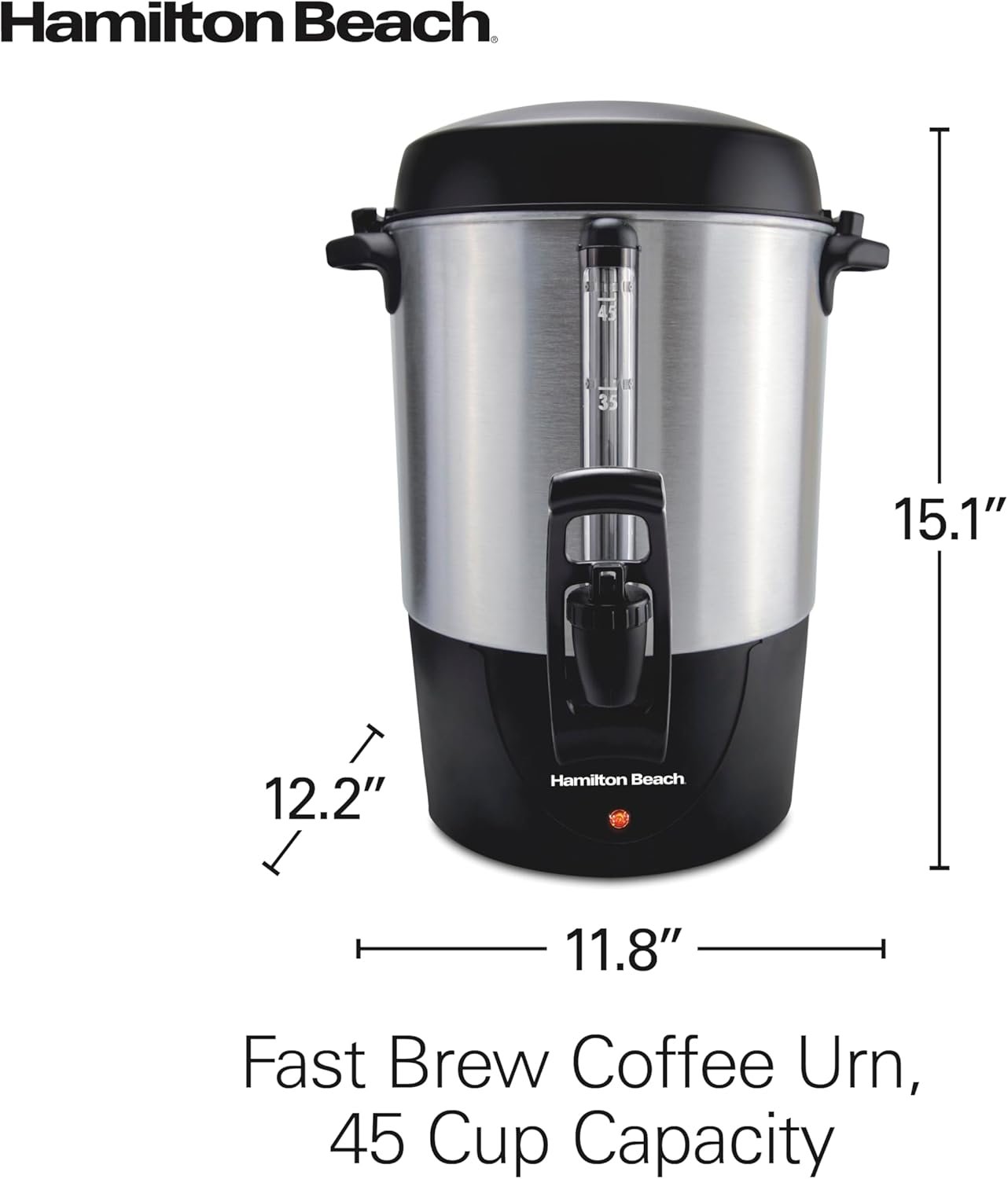 The Hamilton Beach® Fast Brew Coffee Urn brews coffee fast. It makes 15-45 cups of coffee, brewing 45 cups in just 28 minutes. The urn has dual heaters to keep coffee hot without overheating, one-hand dispensing and a removable filter basket.