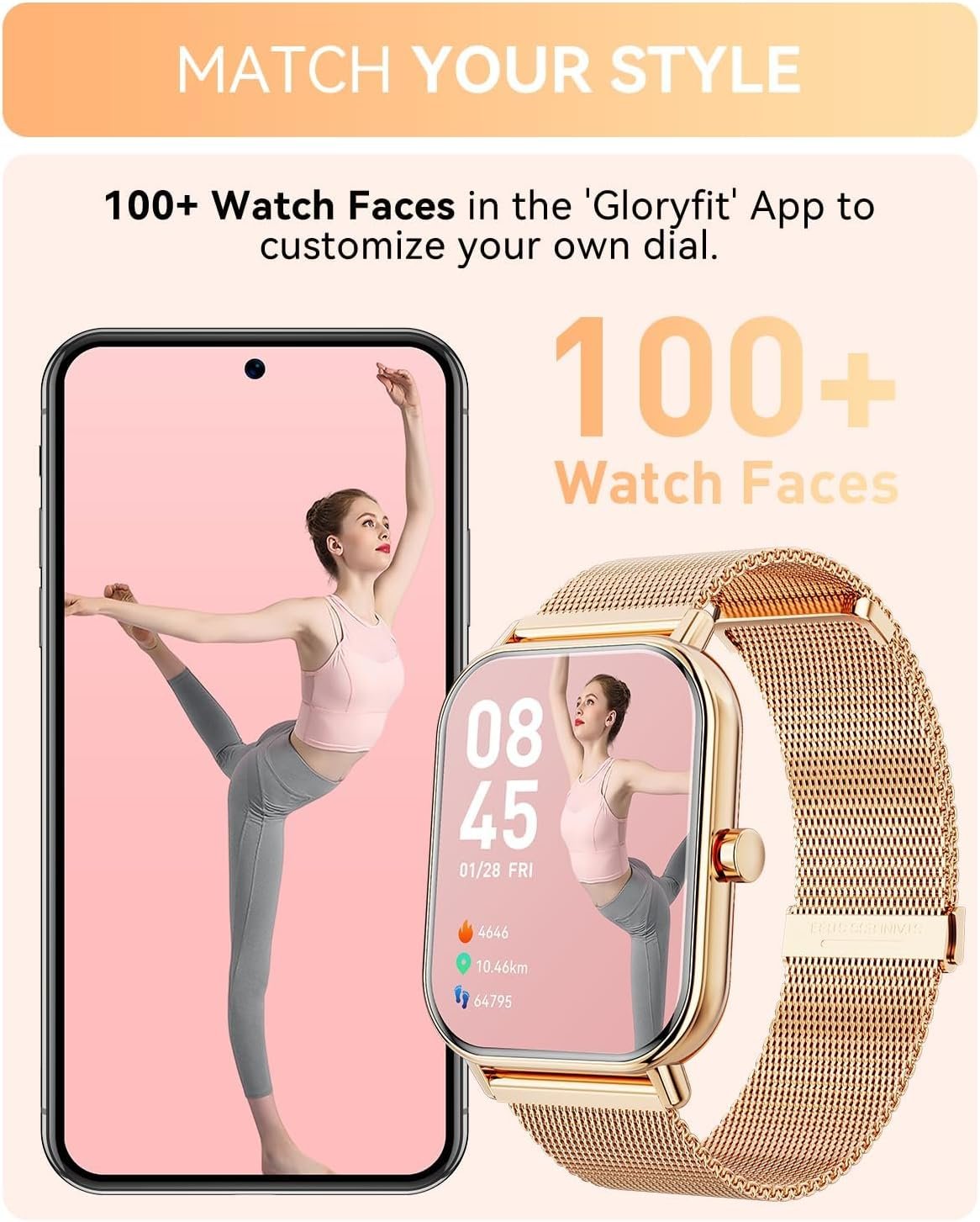 2 watch straps, 2 wearing styles: This smart watch for women men features a large screen design and comes with two interchangeable bands. The bright gold frame and gold stainless steel strap add a touch of elegance to any outfit. The smart watch for android phones offers a variety of built-in watch faces, or you can create your own personal photos. When paired with an iPhone, the Smart watch for iphone compatible allows you to use any photo, such as pictures of your family or pets.