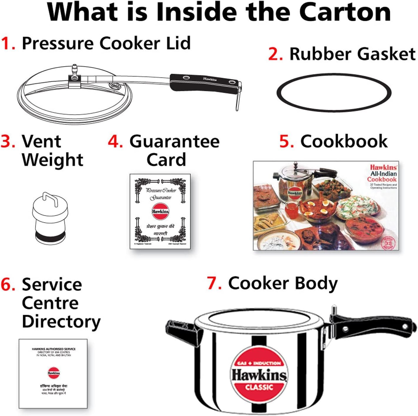 The Classic is Hawkins’ largest-selling, most popular range of pressure cookers – perhaps because of its attractive combination of features, benefits and price. Each Hawkins Classic features an inside-fitting lid. This design is inherently safer than conventional cookers. Thus Hawkins Classic pressure cooker is pressure-locked for safety – like a jetliner door! This range was the first to be introduced by Hawkins and has been kept fresh and current by numerous innovations and improvements over the years. The latest improvement is a 4.06 mm new improved induction base and a superior pressure regulating system that controls pressure to a narrower, more efficient range, reduces sprouting of frothy foods (such as dal) and is easier to insert and remove. The safety valve is located under the lid handle bar so that when it operates the steam is safely deflected downwards. The gasket has minimum exposure to steam inside the cooker, does not rub every time the product is opened and closed – so lasts longer. Stay-cool handles. Fixed sturdy pivot does not put pressure on the plastic handles as it is a part of the metal handle itself. Thus handles last longer. Recommended for use on gas, electric, halogen, ceramic and induction cooktops.