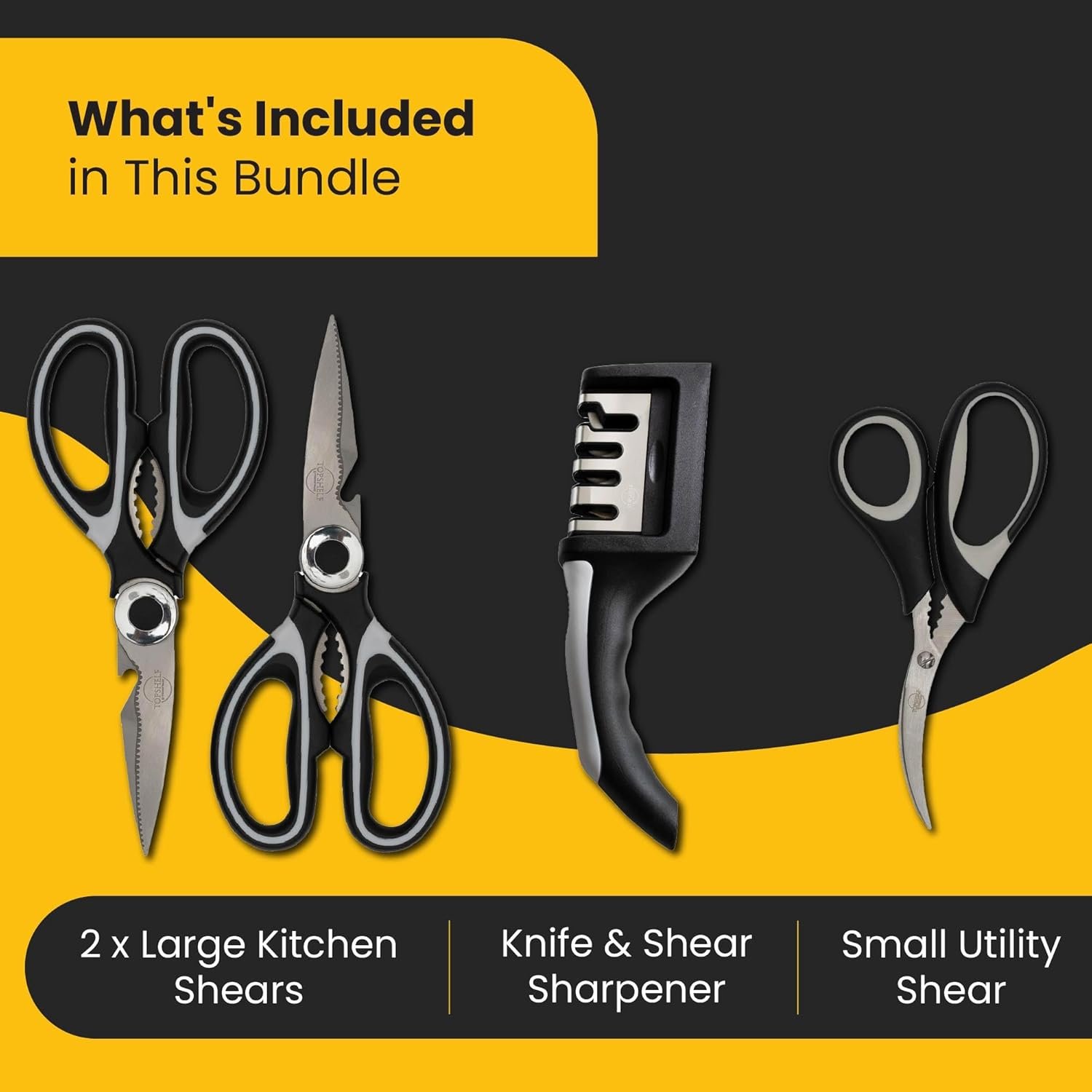 All three kitchen shears in this bundle are made with top-quality, food-grade stainless steel blades. The large shears also have neat bottle openers built into the bottom blades, so you can quickly pop open a ‘cold one’ while you’re prepping and cooking.