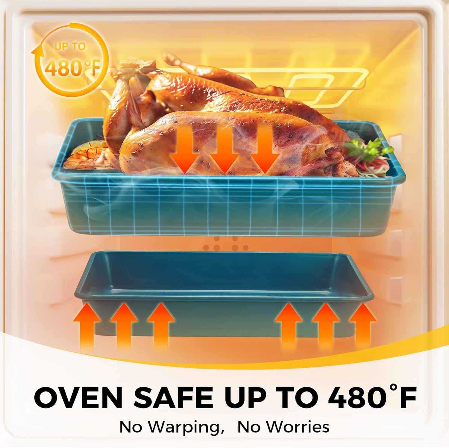 NO WARP DURABILITY: Crafted from 0.6mm thick carbon steel with a 5-layer reinforced design, this small roasting pan set won’t warp, bend, or break—even at 480°F. 15% heavier than standard oven pans, baking pans for oven ensures even heat distribution and durability that lasts for years.