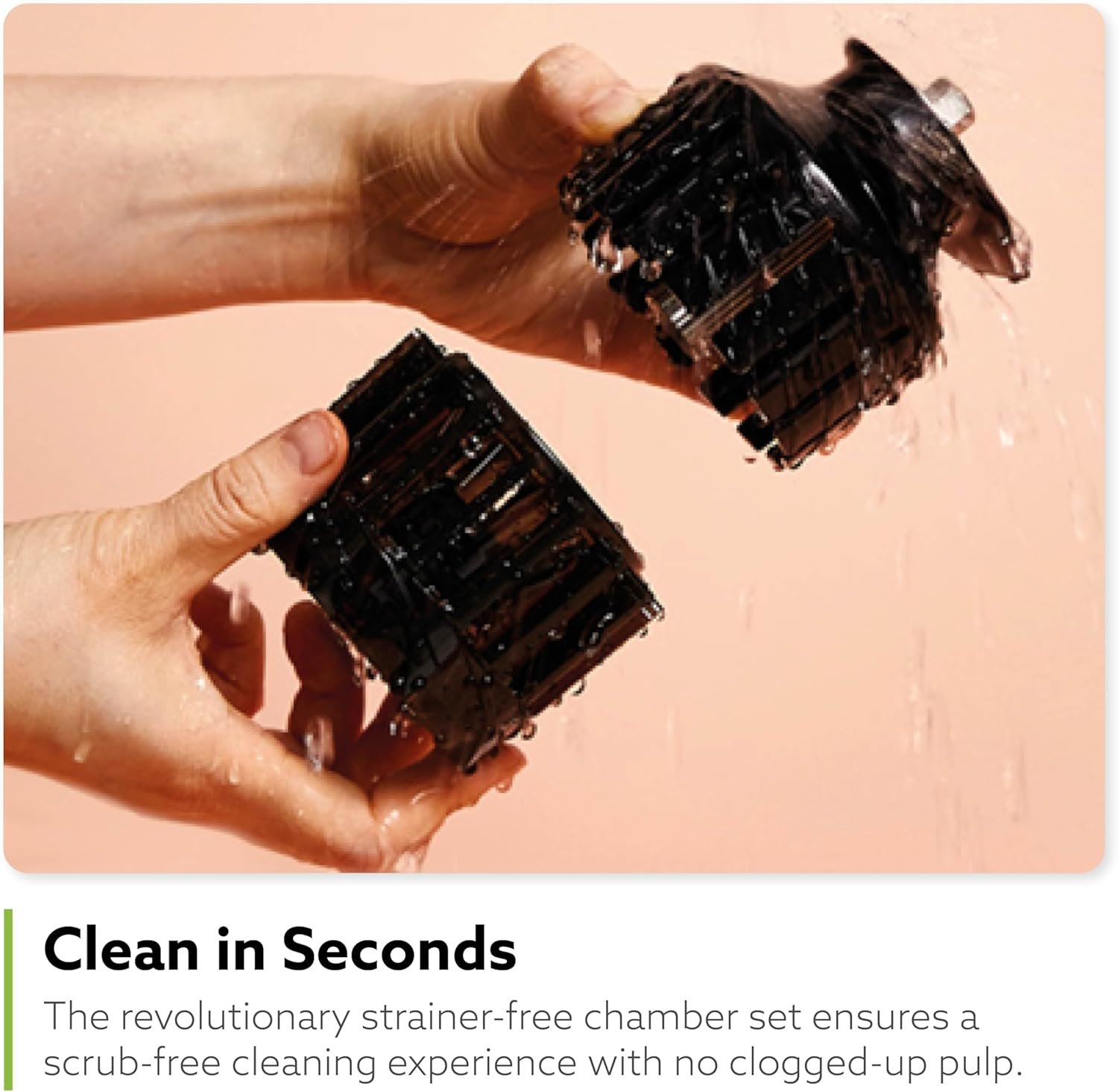 EASY TO CLEAN: Traditional juicers require a strainer which collects minerals and needs extensive scrubbing. The H400 features a revolutionary strainer-free chamber set that ensures a scrub-free cleaning experience with no clogged up pulp.