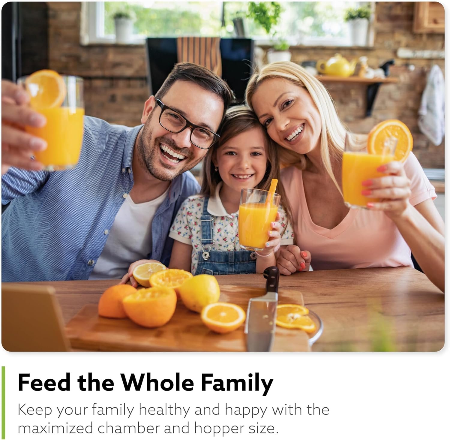 PERFECT FOR FAMILIES: The quiet motor lets you start the morning without causing a stir. The maximized self-feeding hopper lets you fit more ingredients without chopping them up for minimal prep. 100% BPA free with no blades or sharp parts.