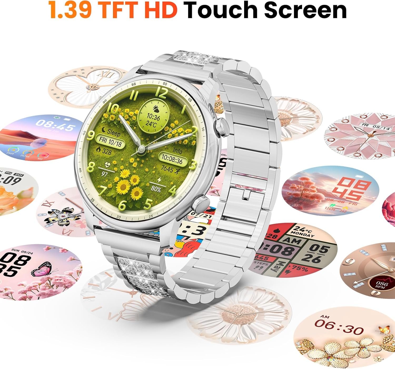 🏆【Outstanding Appearance Design】This smart watch features a polished gold-plated case and a diamond-encrusted strap, highlighting a beautiful and elegant style. It is suitable for both fitness activities and daily wear. The 1.39-inch screen is suitable for most wrist sizes. The TFT HD display provides clear and sharp visual effects, the colors are more stunning.Customize the sports watch face with your favorite photos, such as selfies, pets, or landscapes, to express your personality!