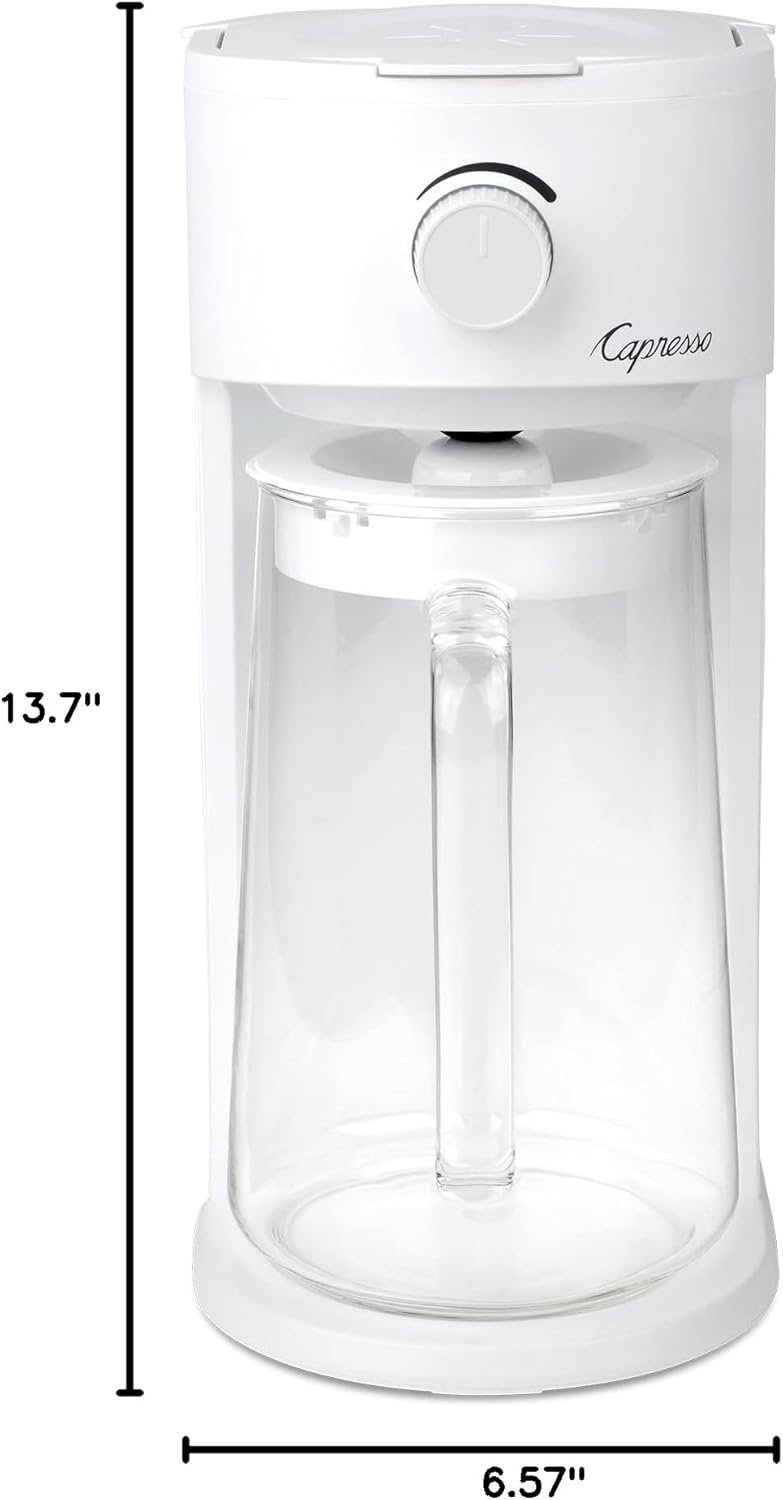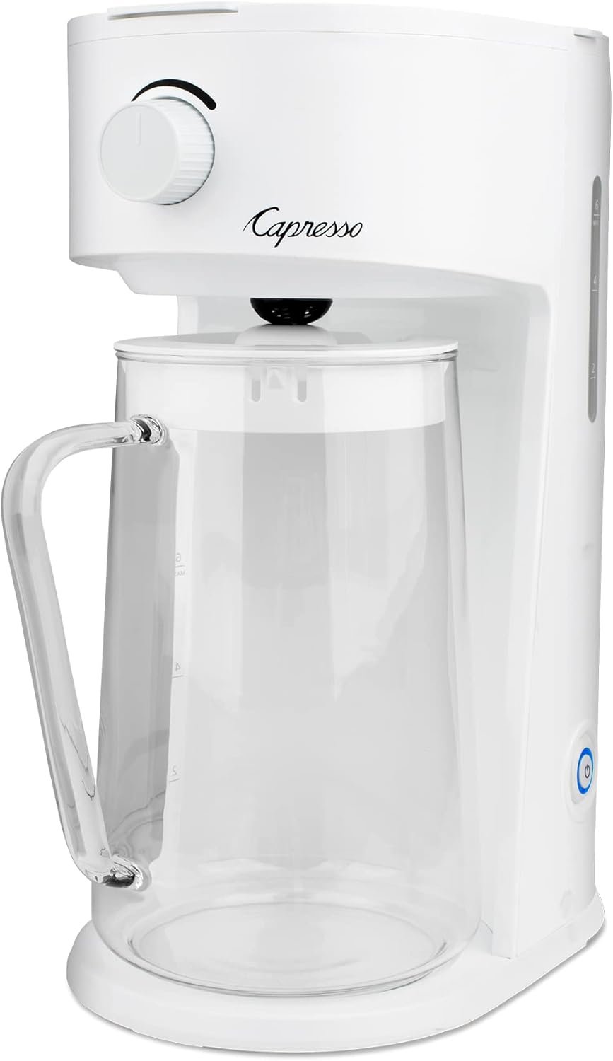 The Iced Tea Select can transform loose tea leaves or tea bags into a refreshing, flavorful beverage in minutes, with minimal effort. Just add loose leaf tea or tea bags to the large, reusable filter basket, fill the non-removable water reservoir, and then add ice to the carafe. The handy dial lets the user customize tea strength from mild to strong. Then press the illuminated on-off button, and in just minutes, a refreshing carafe of flavorful iced tea will be ready to enjoy. The Iced Tea Select can brew black, white, green or herbal tea flavors – or even iced coffee for a change of pace. Convenience features include auto shut off and a removable filter basket. The simple yet sophisticated design – with a matte white exterior and a glass carafe – is a beautiful addition to the tea lover’s kitchen counter, bar or buffet. This is a versatile machine for year-round enjoyment of favorite teas, from delicious fruity peach or blackberry passion teas to classics ranging from Earl Grey or Mediterranean Mint, with or without sweeteners according to taste. Fresh or frozen fruit can be added to the pitcher for a delicious gourmet beverage.