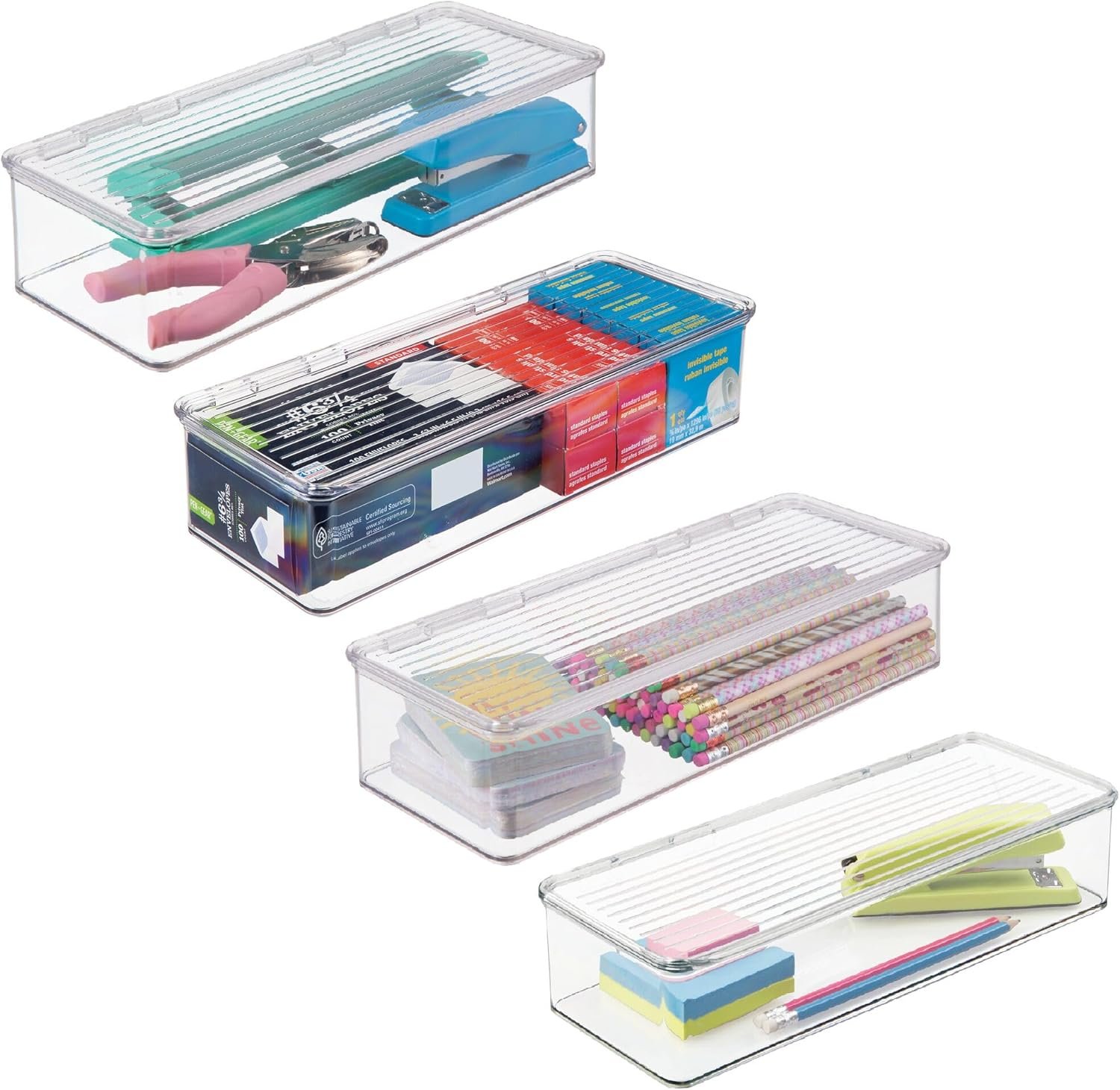 SMART STORAGE – Create a functional storage solution anywhere you need with the iDesign Hinged-Lid Storage Box; Its generous capacity has room to store your most reached-for essentials, from small kitchen gadgets to pantry staples to snacks and more; The versatile design blends seamlessly with your decor, allowing you to keep various kitchen essentials accessible and contained; Set of 4