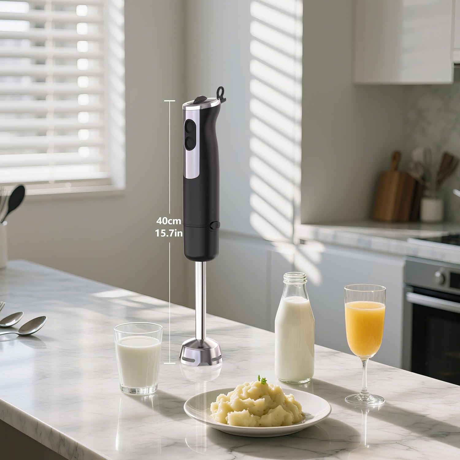 【All-in-One 4-in-1 Kitchen System】Complete Hand Blender Set with Premium Attachments This professional immersion blender comes as a complete set, including a stainless steel whisk for whipping creams and eggs, a milk frother for café-style beverages, and a practical beaker for mess-free mixing. The ultimate all-purpose tool for your kitchen.