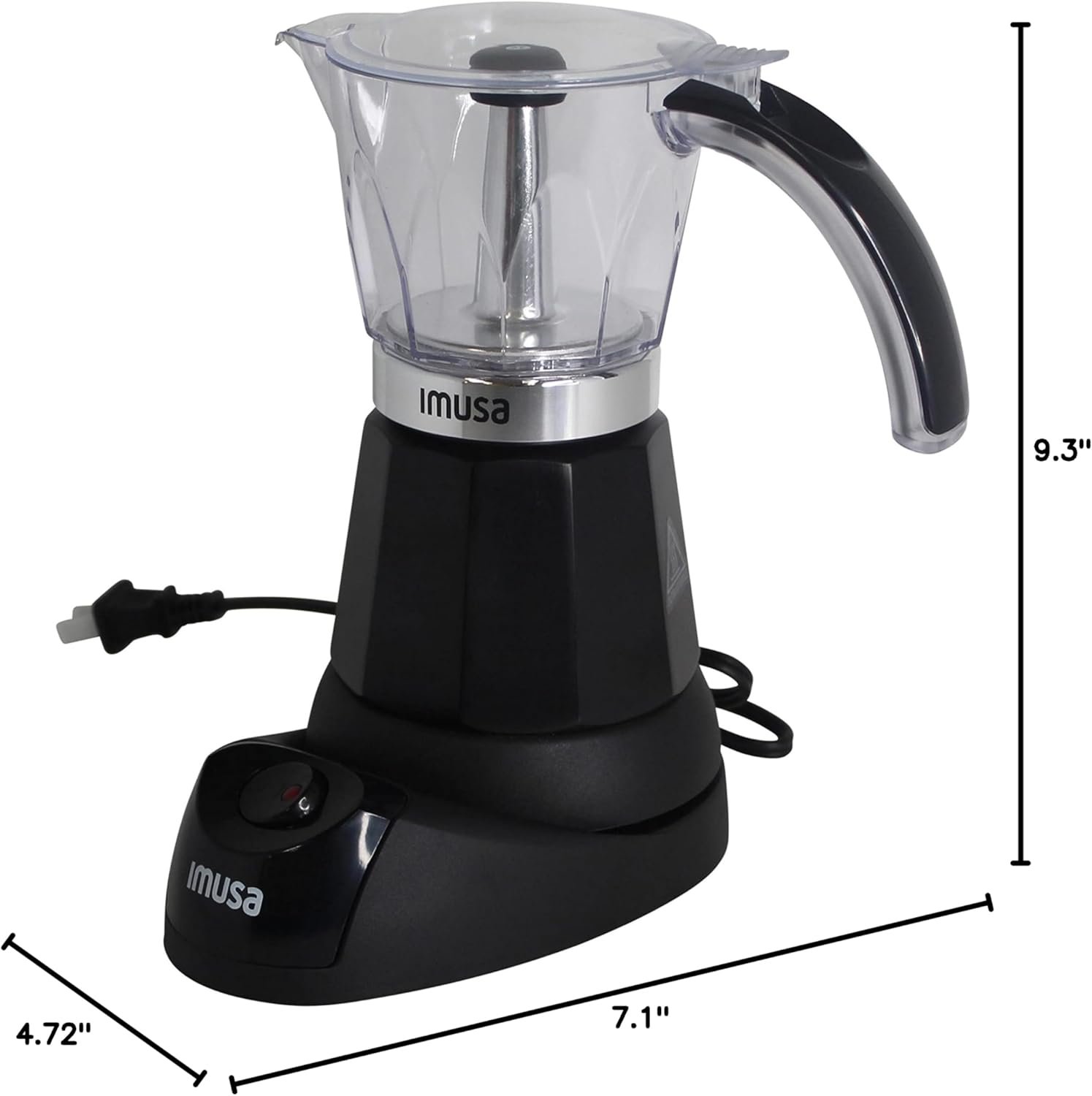 The IMUSA Black Electric Espresso Maker is the perfect appliance for your coffee needs. This trendy coffee maker is made from cast aluminum with an elegant finish, black base and a brown tinted tritan top. Use the IMUSA Black Electric Espresso Maker to brew up to 3 or 6 cups of espresso coffee and you are ready to serve. The IMUSA Black Electric Espresso Maker comes with a detachable base, an on/off switch of this coffeemaker, and a cool touch handle that enables safe operation and convenient pouring. Use this coffeemaker to make traditional espresso, Cuban coffee, Italian coffee, and Moka. Just fill the lower tank with water, place ground coffee in the funnel, and place the carafe on the electrical base. Press the easy one-touch button and the espresso maker will do the rest! Feel the coffeehouse experience in the comfort of your home with the IMUSA Black Electric Espresso Maker, it will surely make every sip a moment to savor.