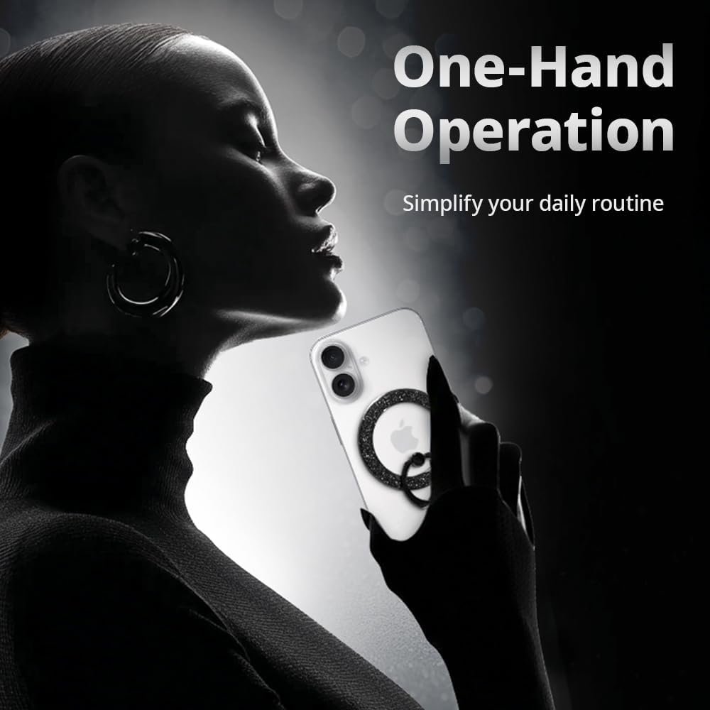 iRing Magnetic Phone Ring Holder for MagSafe, 360° Rotation Finger Grip Stand Compatible with iPhone 17/16/15/14/13/12 – Strong Magnetic Grip, iRing Mag Glam (Black)