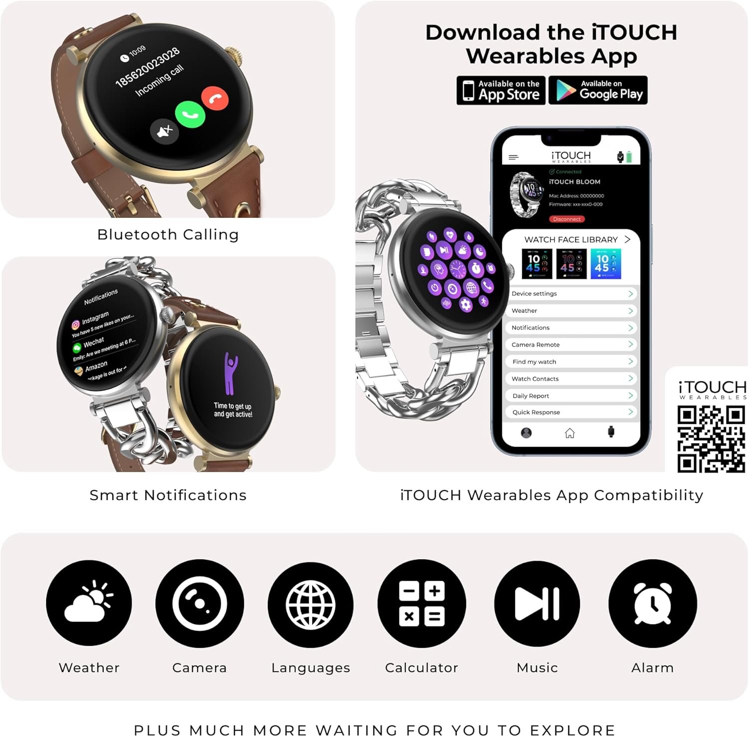 Bring beauty, balance, and smart performance to your wrist with the iTOUCH BLOOM—a thoughtfully designed smartwatch created to fit your lifestyle. With its sleek round profile and vibrant 1.32” AMOLED display (466×466 resolution), BLOOM delivers a crystal-clear viewing experience in a sophisticated, lightweight form. Stay connected and in control with Bluetooth calling, smart notifications, voice assistant support, and music/camera controls. Prioritize your wellness through 24/7 heart rate, SpO₂, stress, and sleep tracking, plus over 60+ workout modes ranging from Pilates and yoga to HIIT and cardio dance. Rated IP68 water-resistant and powered by a 300 mAh battery, BLOOM provides up to 7 days of typical usage, or up to 20 days in battery saver mode. Customize your style with interchangeable bands and elegant finishes in Gold, Silver, or Rose Gold. Compatible with both Android and iOS via the iTOUCH Wearables App, BLOOM is your daily companion for health, fashion, and function—beautifully in sync.