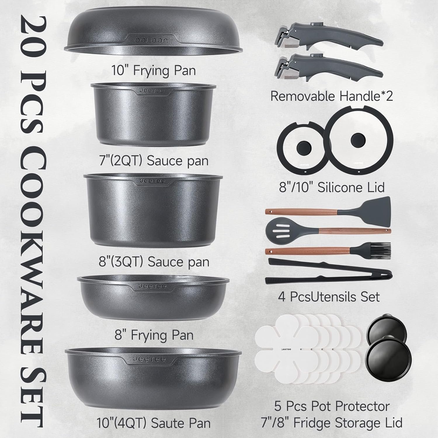 JEETEE 20 Pcs Pots and Pans Set Non Stick, Titanium Reinforced Nonstick Cookware Set with Detachable Handle, Induction Kitchen Cookware Sets, Oven Safe & Space Saving for RV Camping