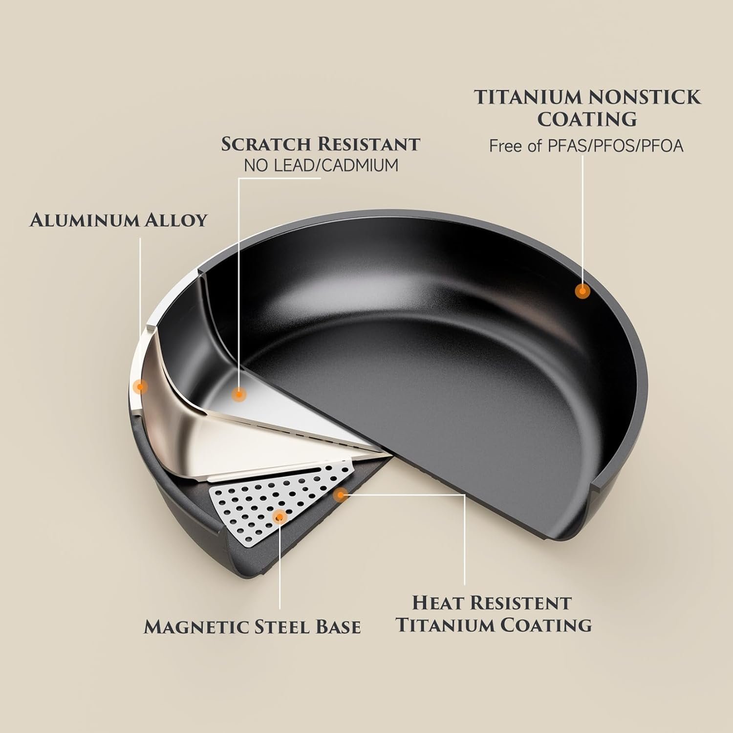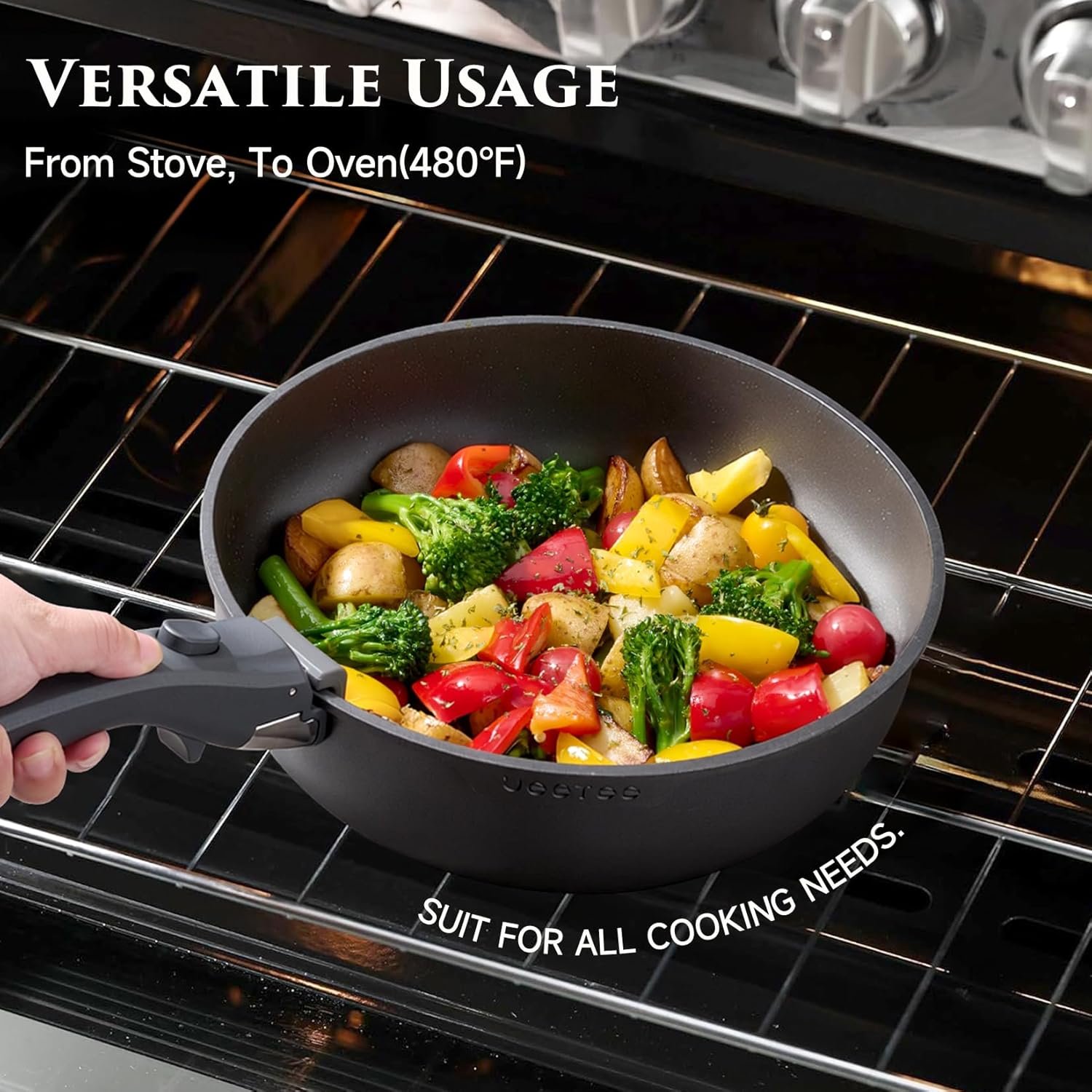 Fast Heat, All-Stove & Oven: Experience precision cooking. The premium aluminum core in this titanium cookware set ensures rapid, uniform heat with no hot spots for consistent searing. It works on all stovetops (induction, gas, electric, ceramic) and is oven-safe to 480°F for a seamless transition from stove to oven.