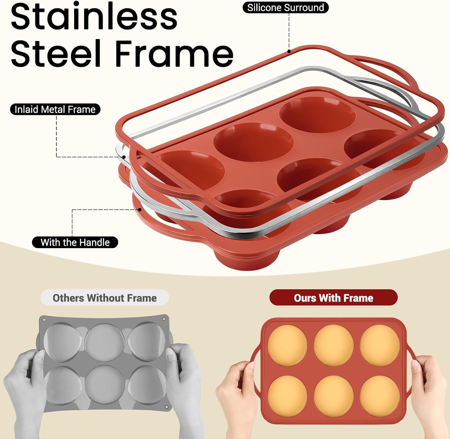 Sturdy Design: Our jumbo muffin pan features a metal frame with handles on both sides, allowing you to easily move the pan without needing a support tray, providing durability and stability and can be hung for storage