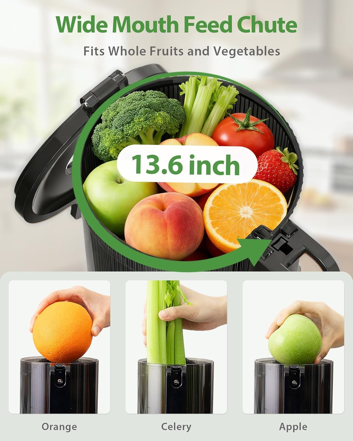 【Wide Feed Chute & Hands-Free Juicing】 Drop in whole fruits and vegetables—no pre-cutting needed. The large feed chute with auto-feeding design lets you juice hands-free, saving time for busy mornings and family routines.