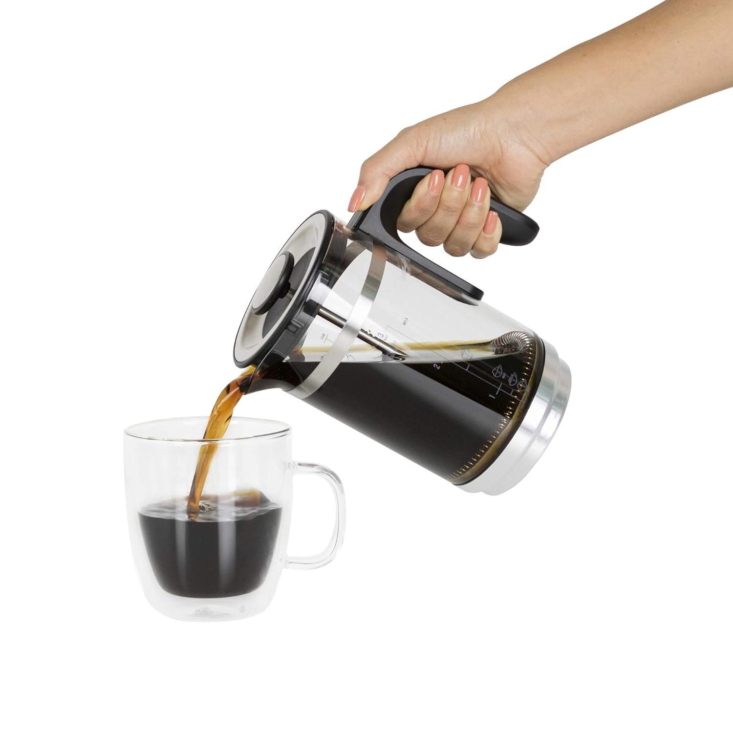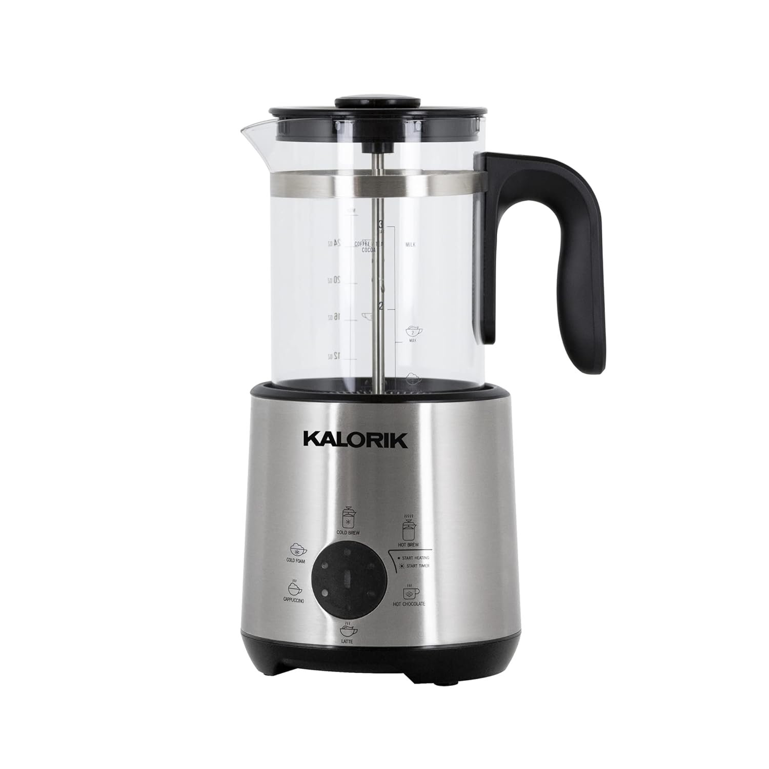 Meet your very own personal barista! This 8-in-1 beverage maker brings an authentic coffee shop feel into the comfort of your kitchen. The Kalorik Bartista gives you all the bold, flavorful benefits of a French press, with the versatility of an artisanal cafe. The Kalorik Bartista can make cold brew coffee or tea, hot coffee or tea, hot chocolate, cappuccinos, lattes and cold foam – at the touch of a button. This innovative electric French press features six one-touch presets for creating a wide variety of hot and cold barista-style beverages. A magnetic drive motor and frothing disc deliver rich and airy frothed milk, perfect for making cappuccinos, macchiatos, lattes, and hot chocolate. The special chocolate melting function allows you to add chocolate chips or chunks directly into the pitcher to make decadent hot chocolate. The stainless steel cage prevents the stirring element from getting clogged during melting. The Bartista comes with a removable glass pitcher and a French press accessory. A high-power heating element reaches up to 200°F. A 24-oz brewing capacity yields 3 large servings of coffee, or 2 servings of frothed milk.